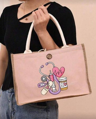مجموعة حقيبة يد وحقيبة تجميل ذات موضوع ممرضة بلون وردي، بطبعة أدوات طبية كالسماعة الطبية والقلب والإبرة والمقياس الحراري والأقراص الدوائية، بشكل عصري وبنية قماشية، مناسبة لموسم العودة للمدارس والرحلات والسفر، حقيبة يد وكتف للجنسين، هدية مثالية للاحتياجات اليومية