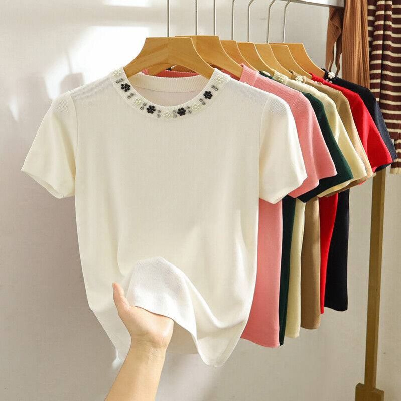 سترة نسائية محبوكة بأكمام قصيرة وقميص مطرز بالخرز وقمصان قصيرة ضيقة وأساسية ناعمة