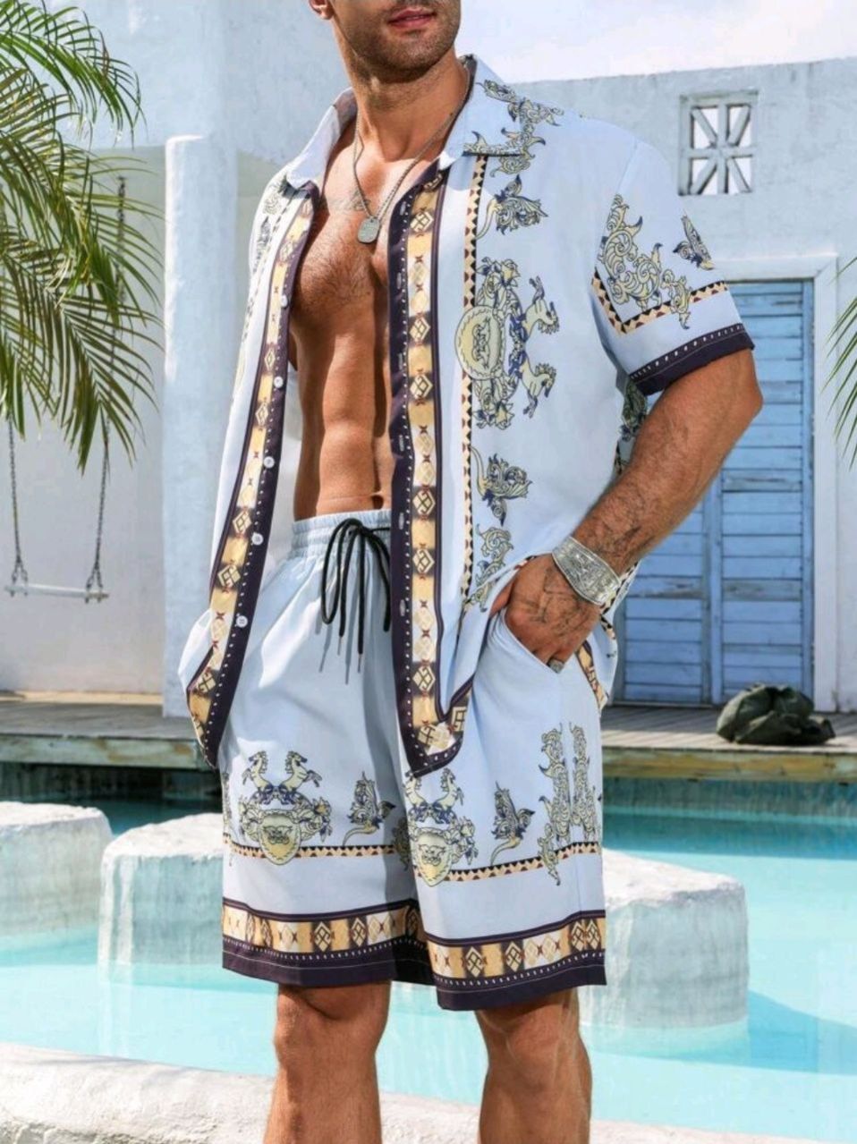 طقم قميص وشورت رجالي من Manfinity RSRT صيفي للشاطئ مطبوع عليه أزهار بأكمام قصيرة فضفاضة للزوج