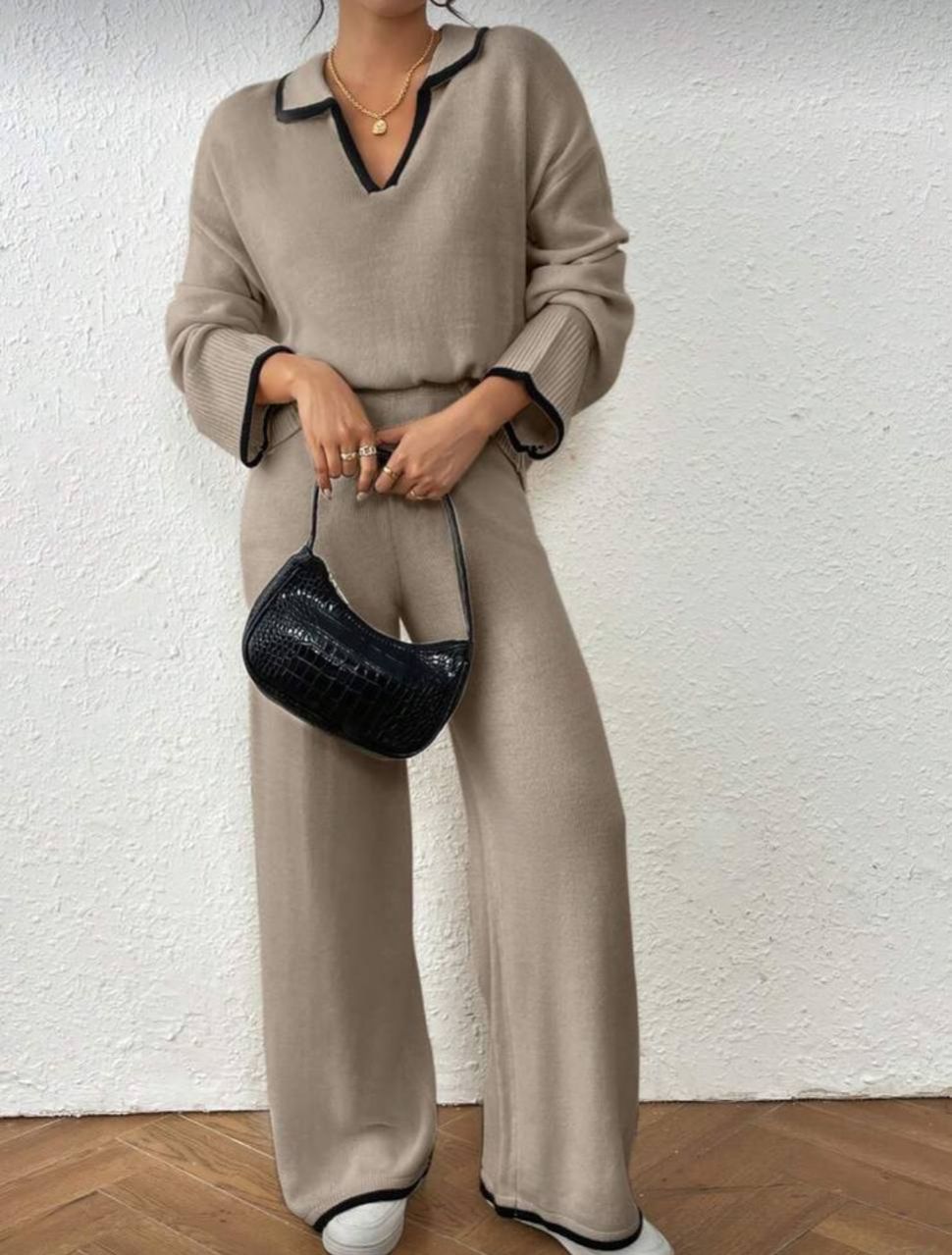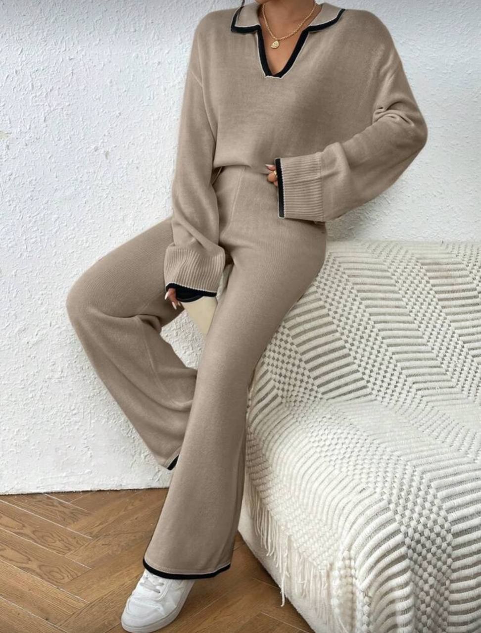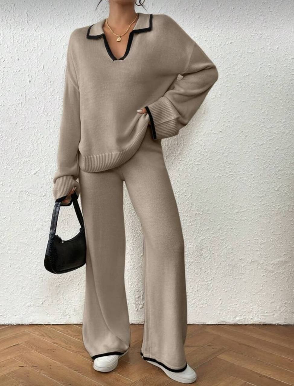 طقم كنزة صوفية كاجوال فضفاضة بياقة على شكل حرف V مع تباين في الحواف وبنطال فضفاض واسع الساق مصنوع من الأنسجة المحبوكة للنساء