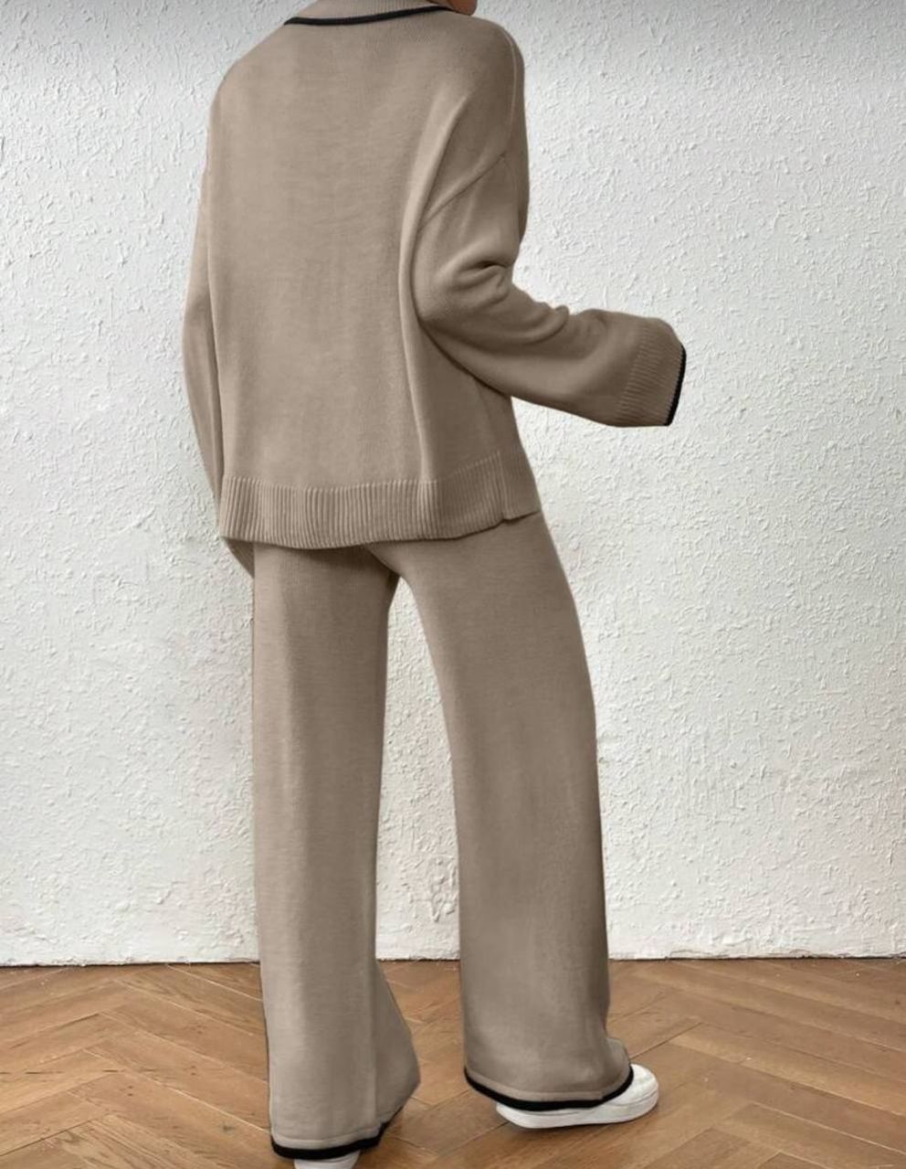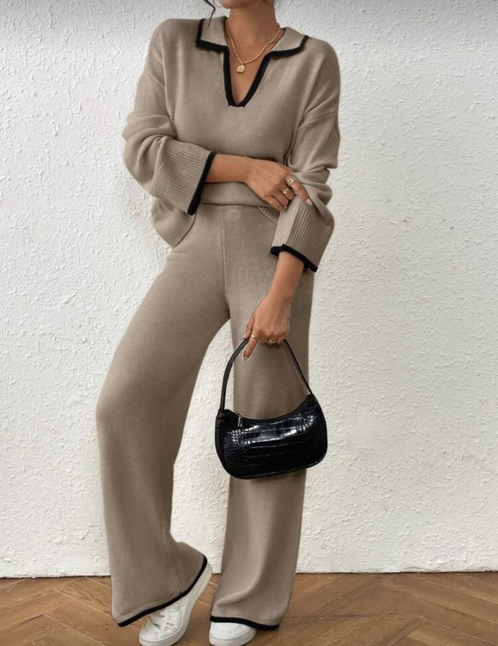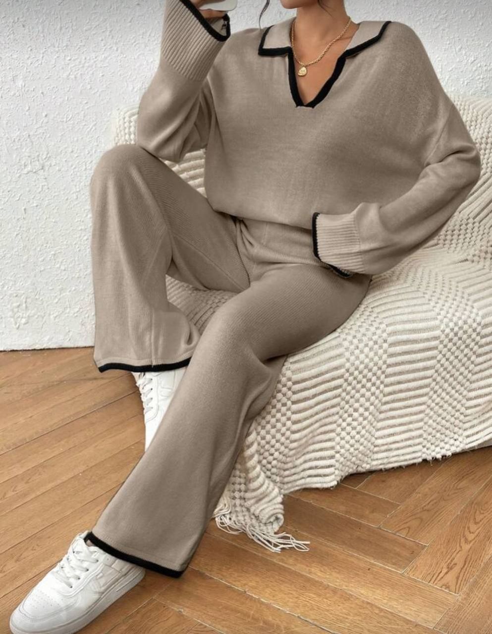 طقم كنزة صوفية كاجوال فضفاضة بياقة على شكل حرف V مع تباين في الحواف وبنطال فضفاض واسع الساق مصنوع من الأنسجة المحبوكة للنساء