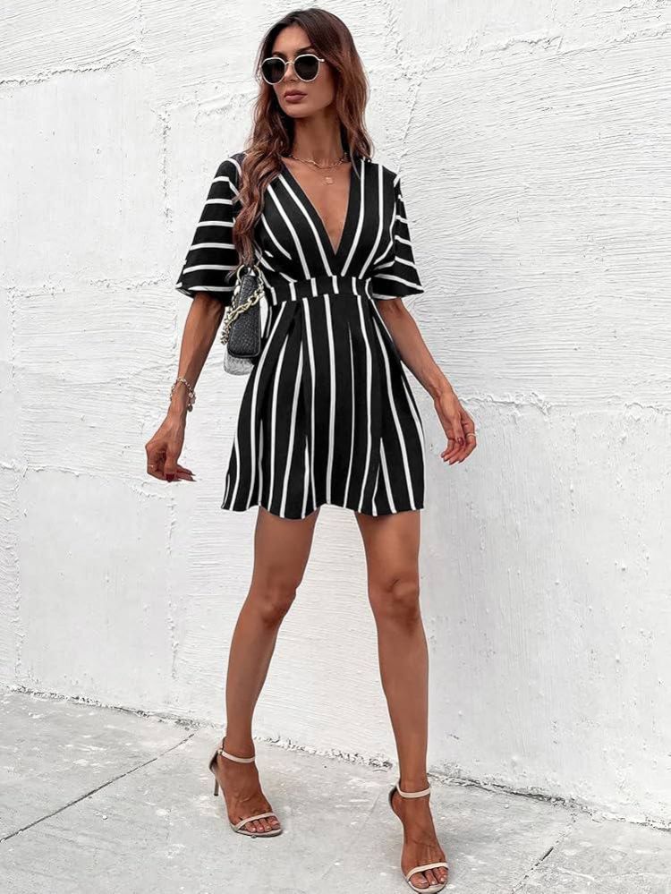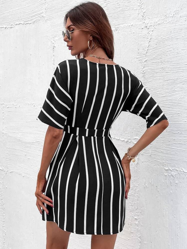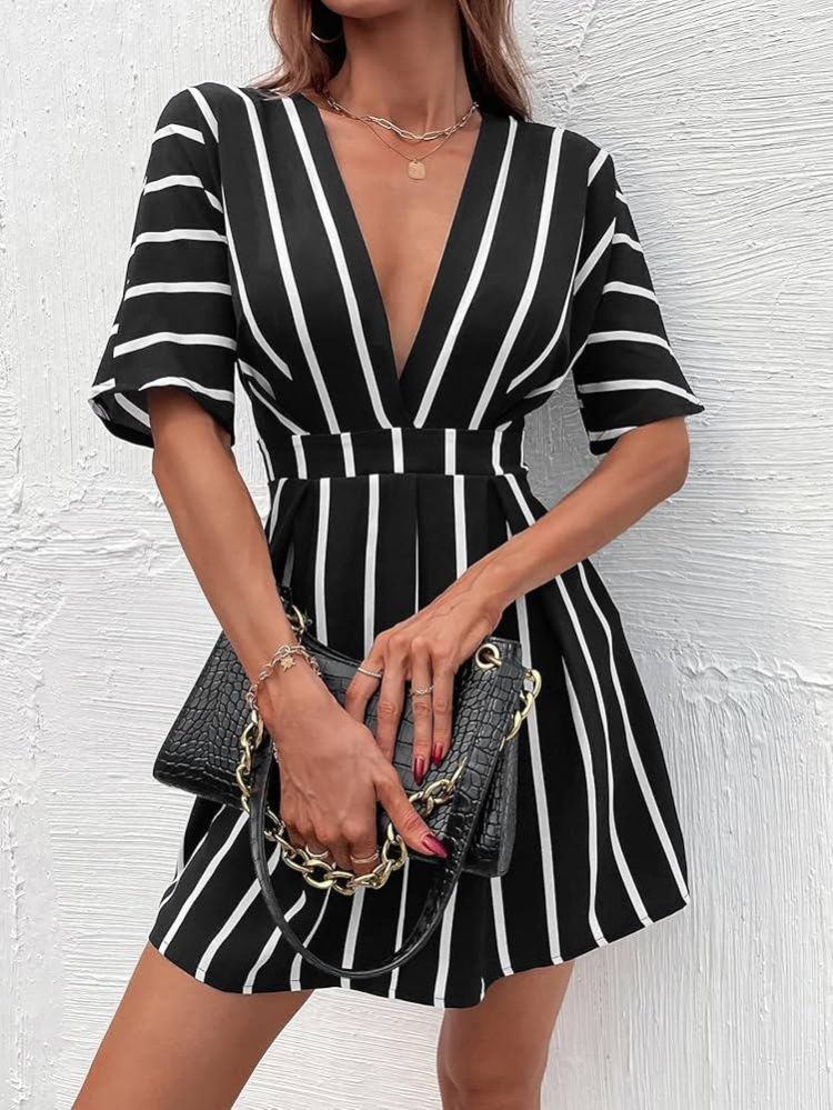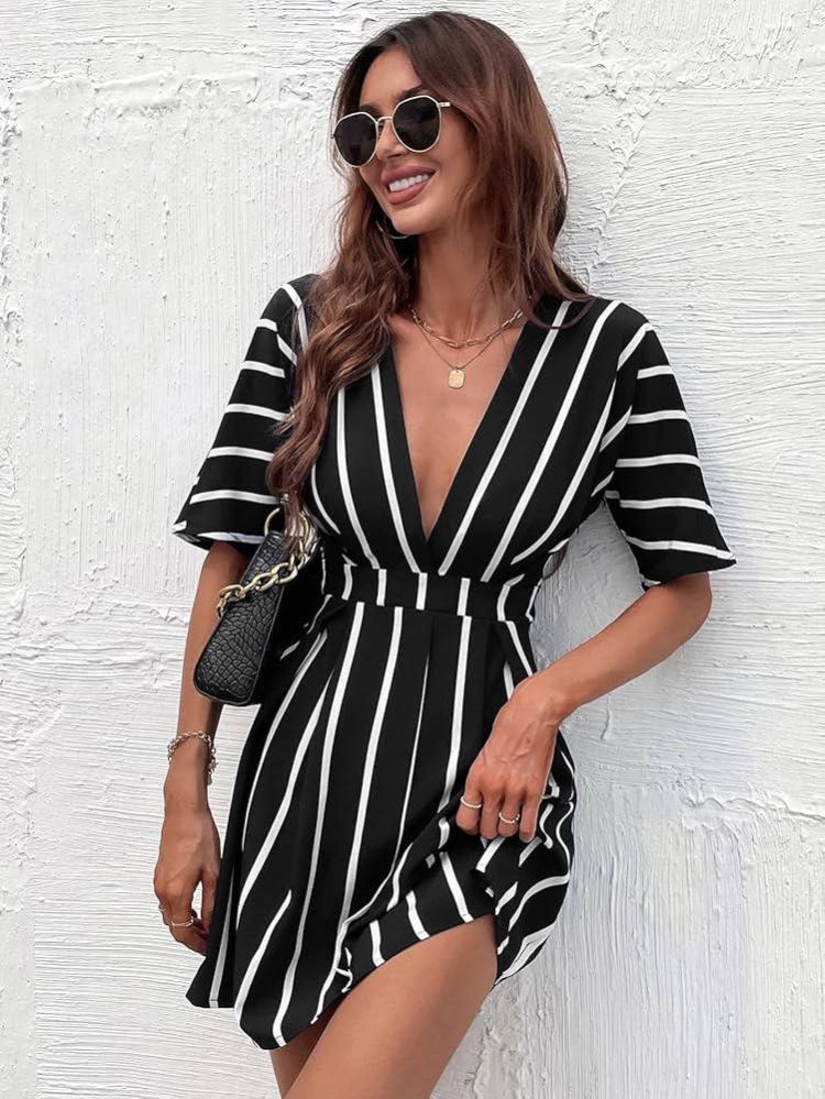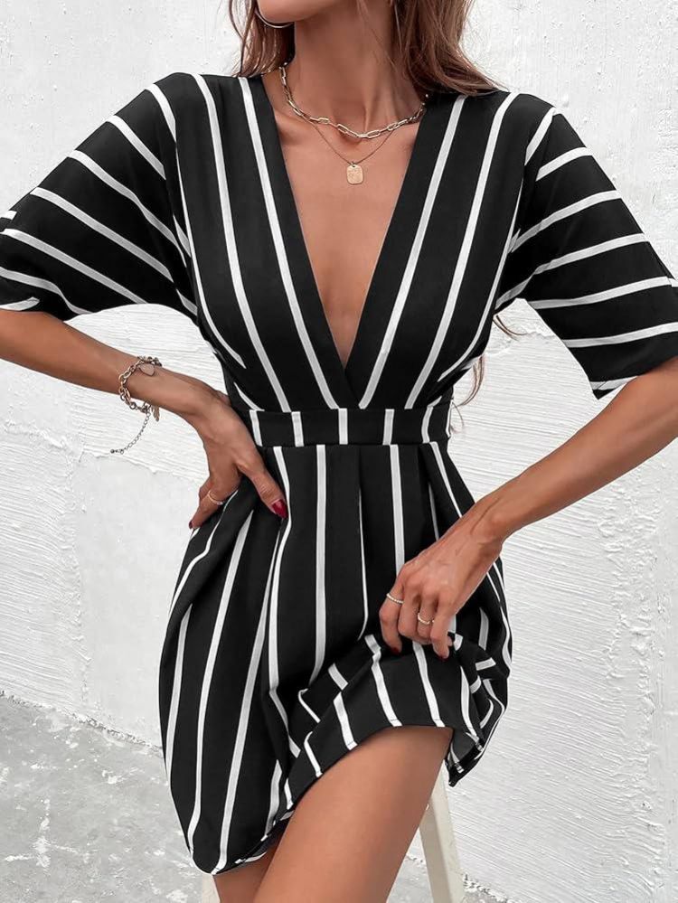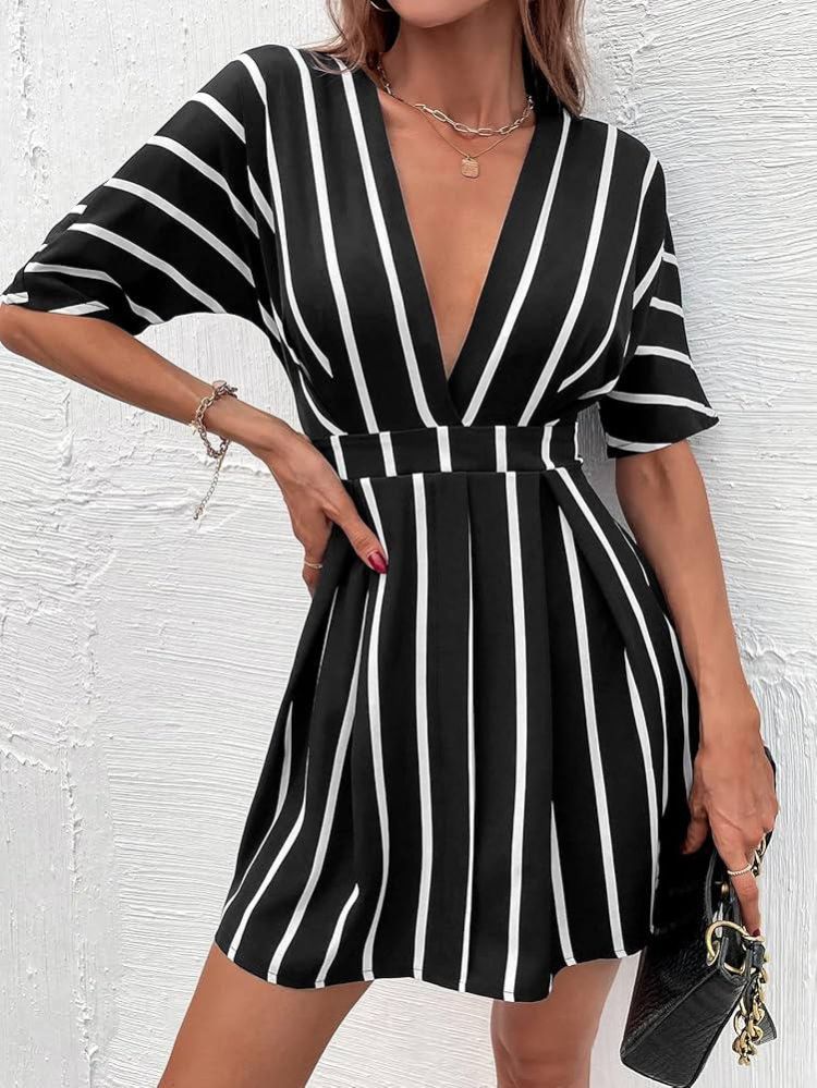 فساتين الربيع ZYQZXHN نسائية مخططة برقبة غاطسة مطوية التفاصيل (اللون: أسود وأبيض، المقاس: L)