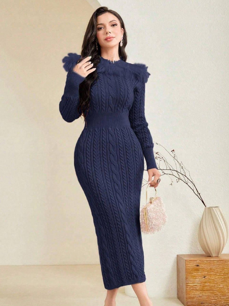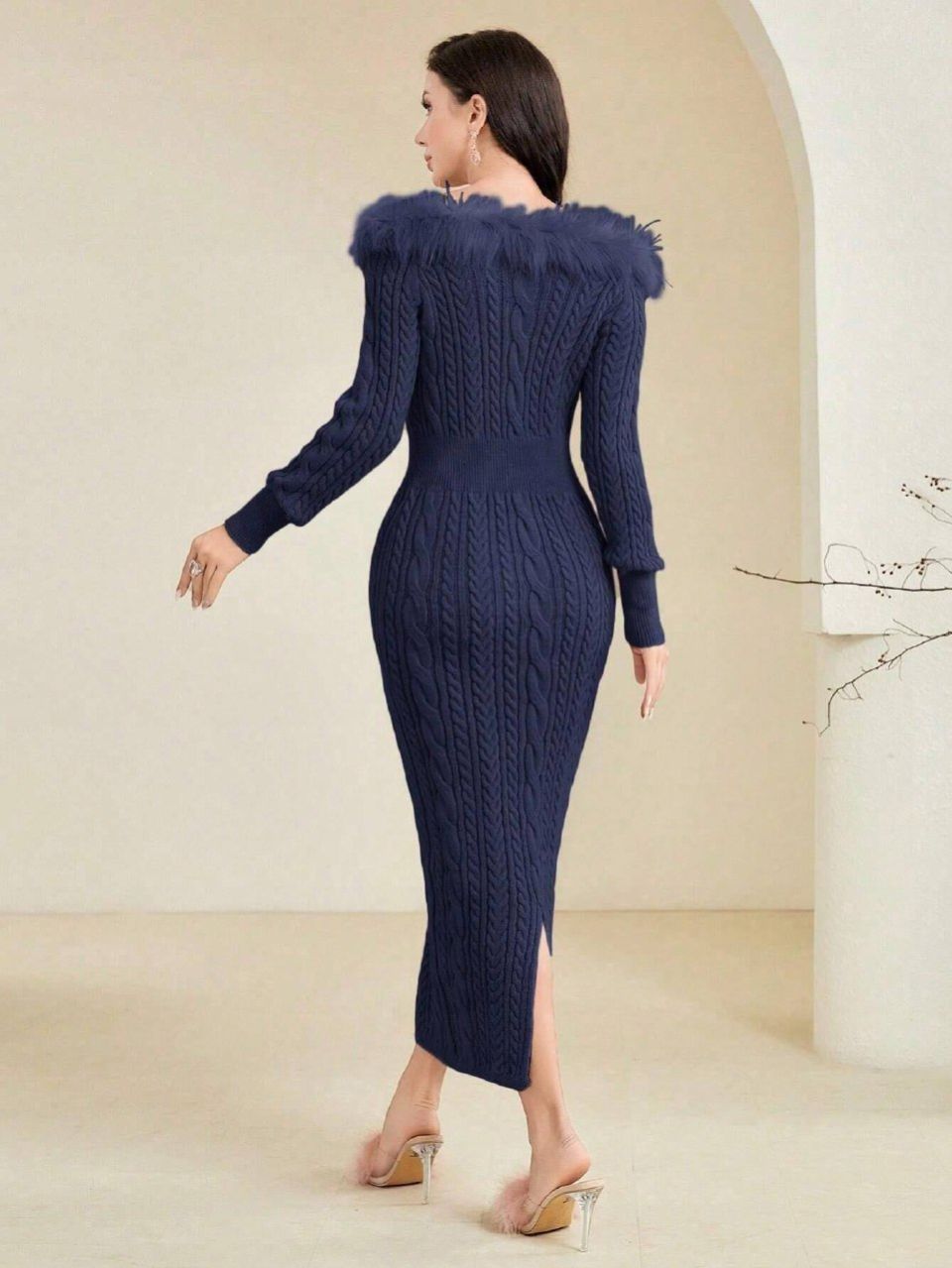 فستان صوف أزرق داكن من شي إن موديلي مع فرو، مقاس صغير 26121