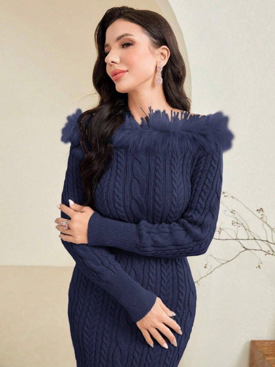 0 Review Of Product فستان صوف أزرق داكن من شي إن موديلي مع فرو، مقاس صغير 26121