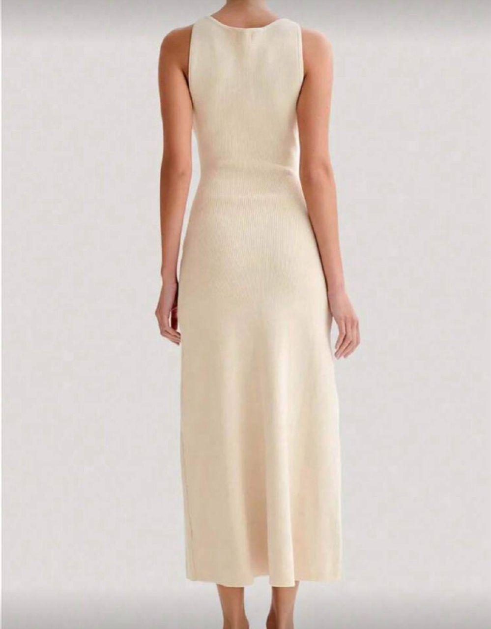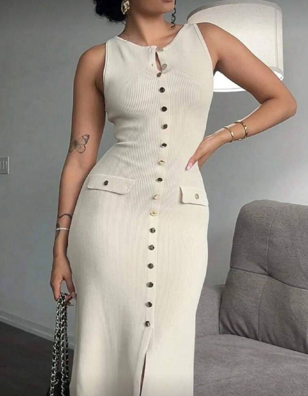 فستان ماكسي مُحبوك أنيق للنساء، ذو خصر عالي وتصميم نحيف بدون أكمام، تصميم أزرار أمامي، مناسب للربيع والصيف والخريف، للمناسبات الرسمية والكاجوال والحفلات