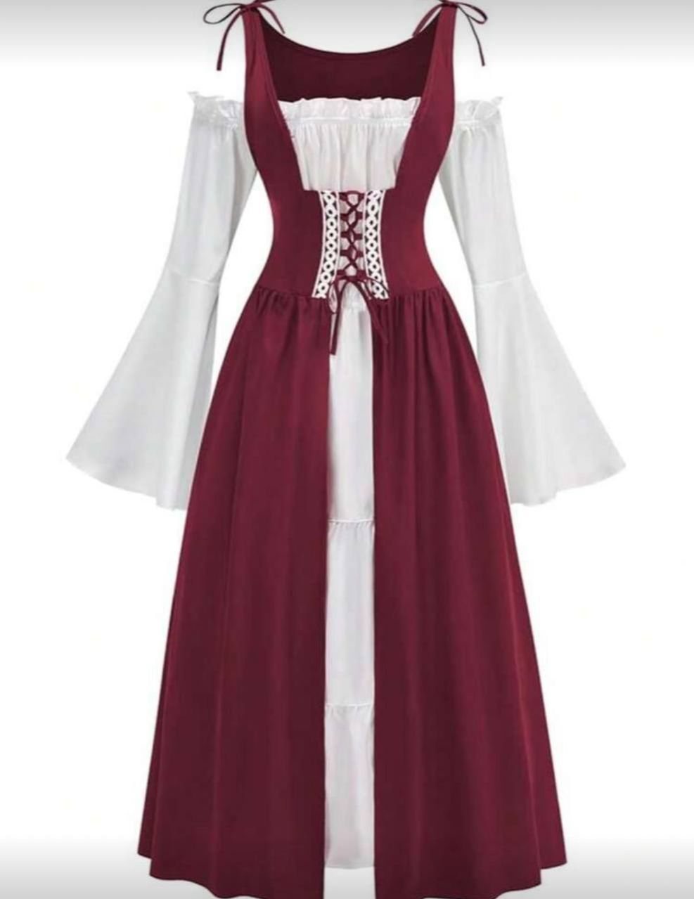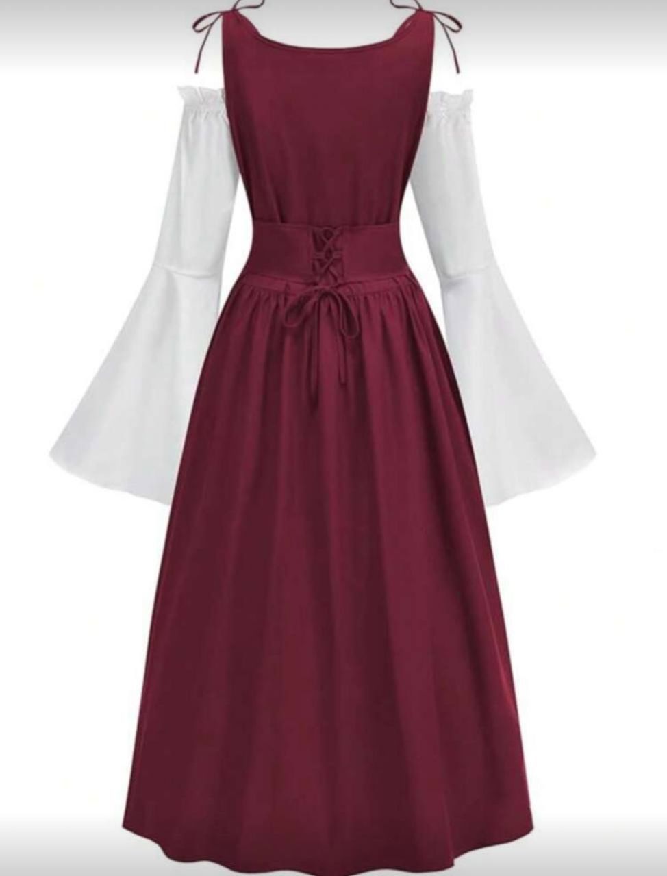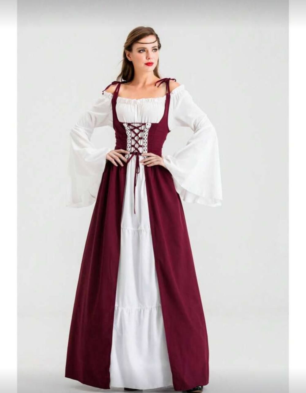 فستان نسائي بحمالات رفيعة وأكتاف مكشوفة وأكمام جرس من قماش مرن للاستخدام في فعاليات التنكر والحفلات ذات الموضوع الرينسانسي والعصور الوسطى