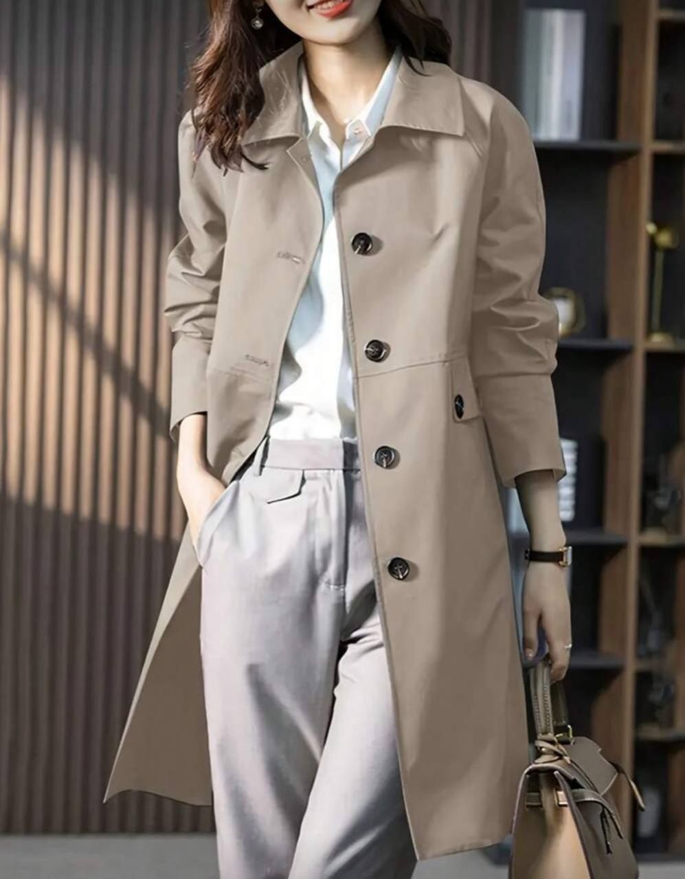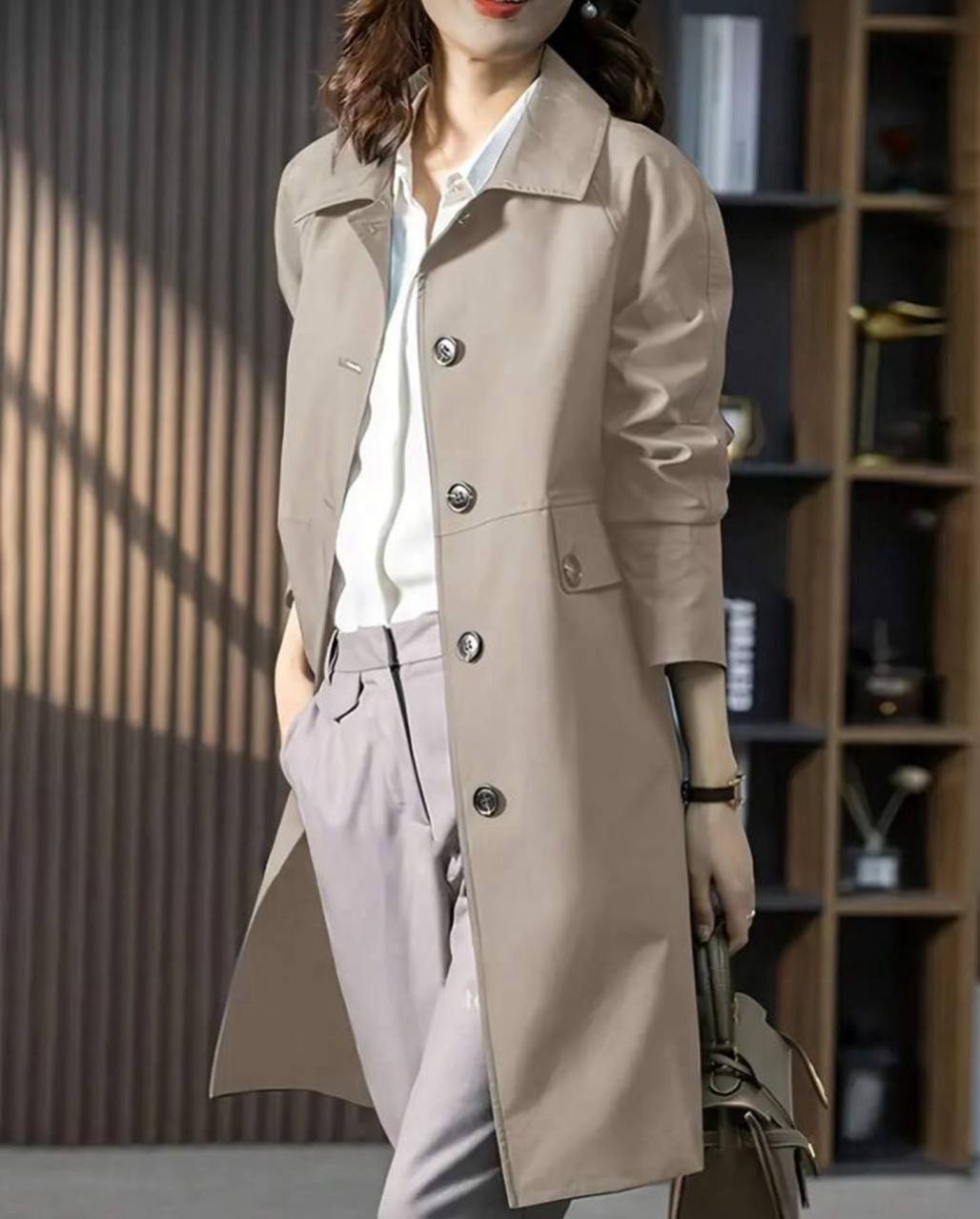 قبضة من قماش منسوج ذات لون واحد على معطف خندق أكمام طويطة متوسط الطول للتنزه والعطلات والارتداء اليومي والحفلات والسفر ، للربيع