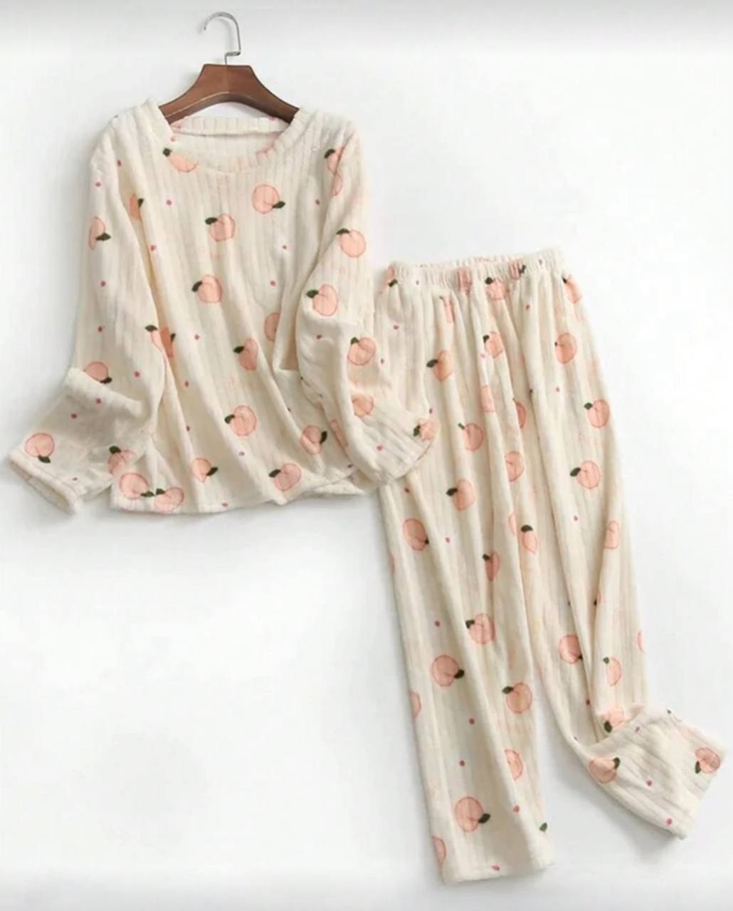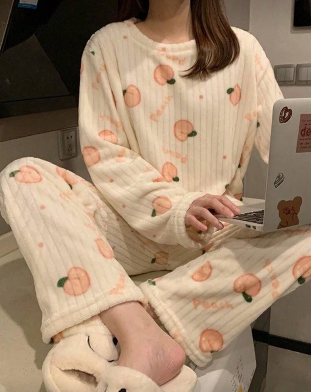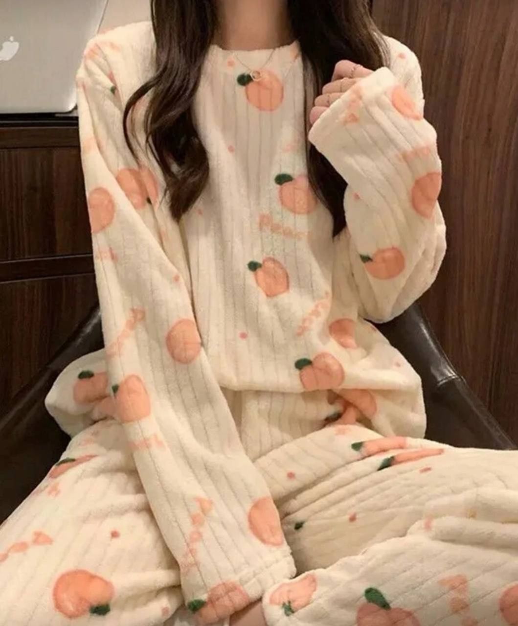 مجموعة بيجامة من قطعتين من الفليس المرجاني الشتوي، ملابس علوية وبنطلون، مجموعة ملابس نوم دافئة، طباعة فواكه طازجة، ملابس خريف وشتاء مريحة