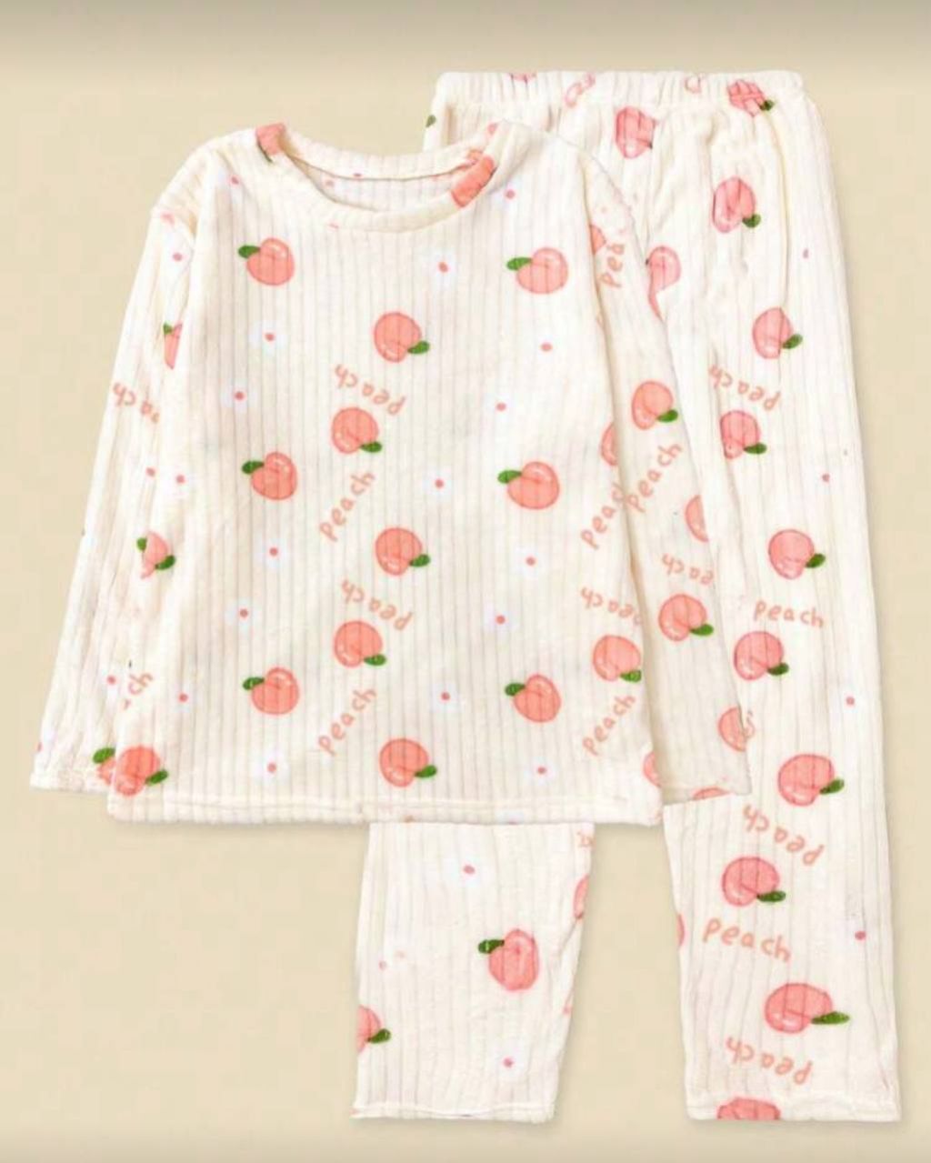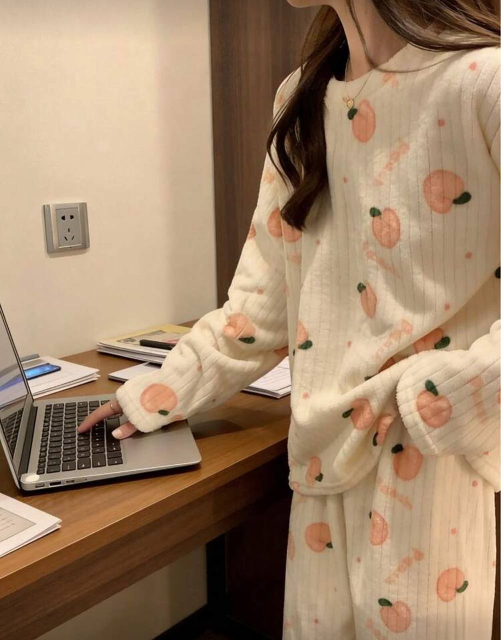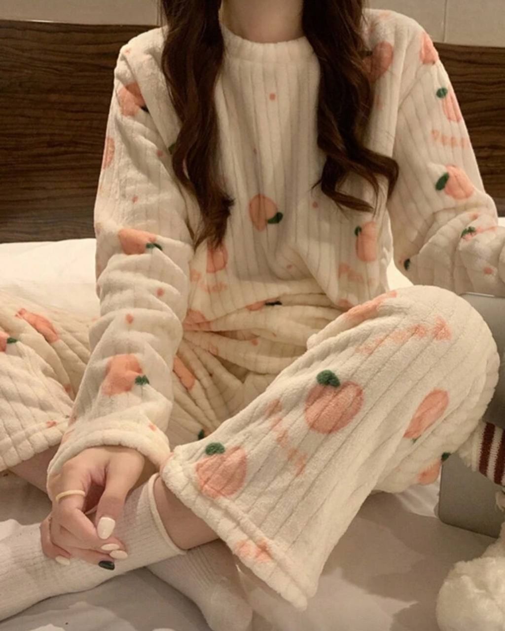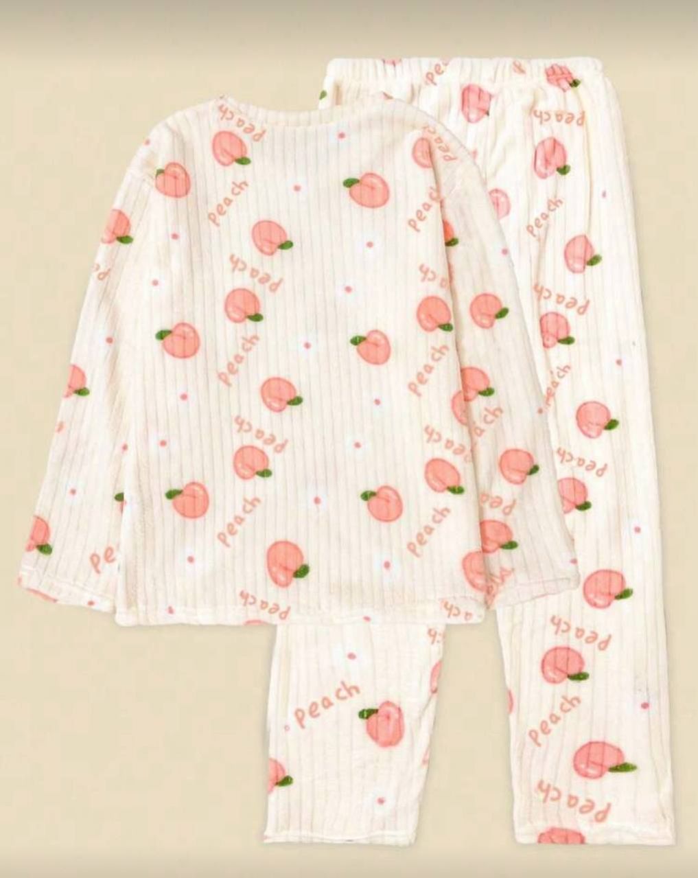 مجموعة بيجامة من قطعتين من الفليس المرجاني الشتوي، ملابس علوية وبنطلون، مجموعة ملابس نوم دافئة، طباعة فواكه طازجة، ملابس خريف وشتاء مريحة