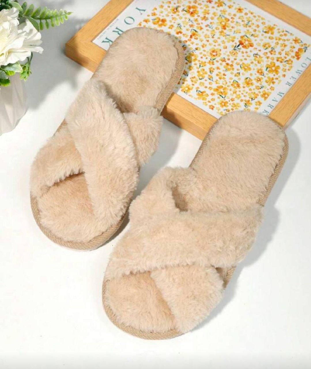 نعال داخلية نسائية موضة الخريف/الشتاء بلون بني فاتح، ذات حزام متقاطع فرو ناعم، وأرضية ناعمة مريحة وصامتة للاستخدام في غرفة النوم