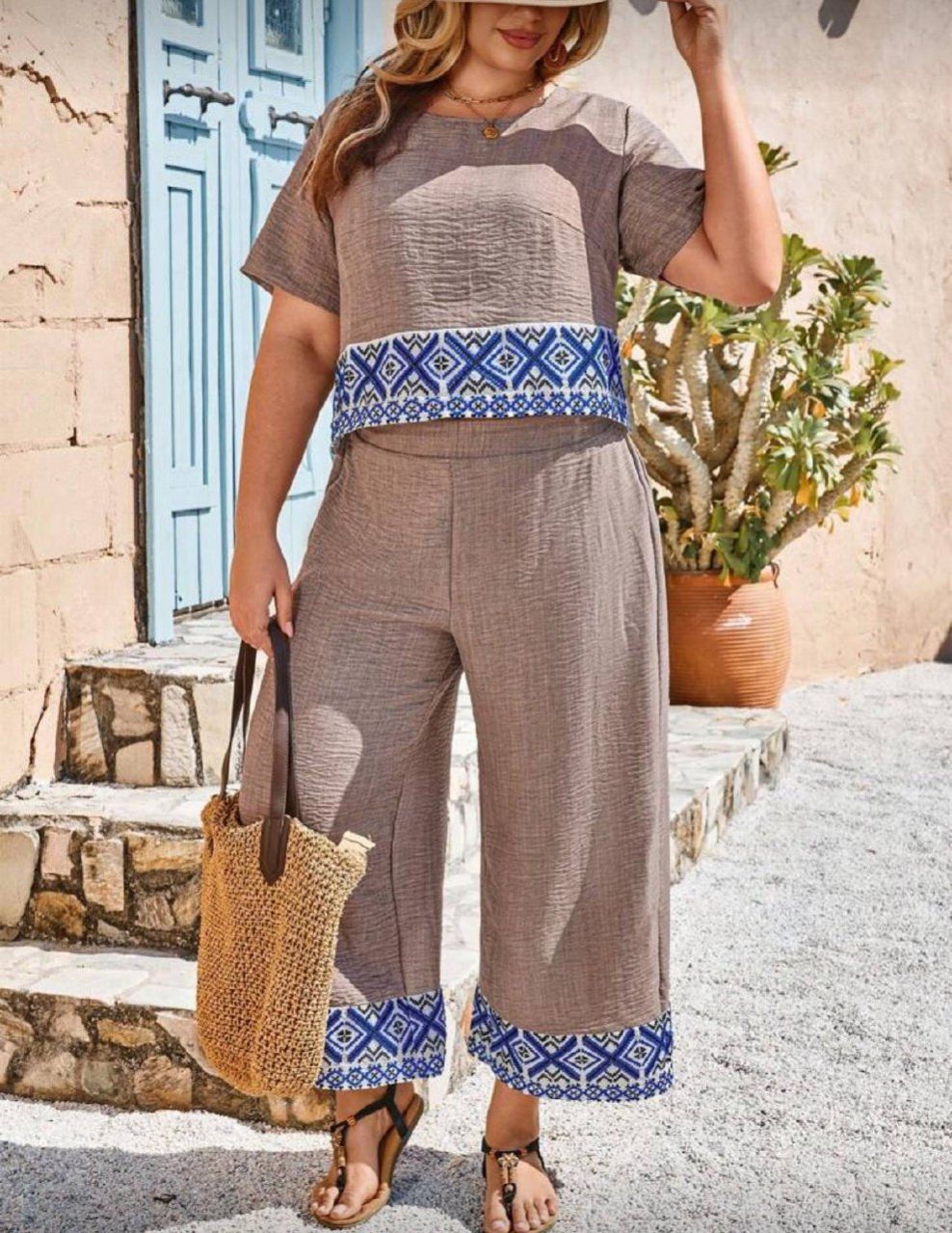 0 Review Of Product Breezaya ملابس نسائية كبيرة الحجم، ملابس علوية نمط هندسي معقد بوهيمي ضمن قماش كتاني مع فتحة رقبة دائرية، وبنطلون خصر مطاطي ذو ساق واسعة، ملابس مكونة من قطعتين، مناسبة لفصلي الربيع والصيف والعطلات
