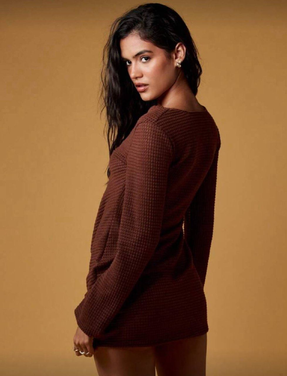MISSGUIDED فستان غطاء مخلوق بالتريكو لارتداء على البحر ذو فتحة رقبة عميقة، للإصطياف، غطاء للملابس السباحة، أكمام طويلة، مناسب للجوانب المائية صيفًا