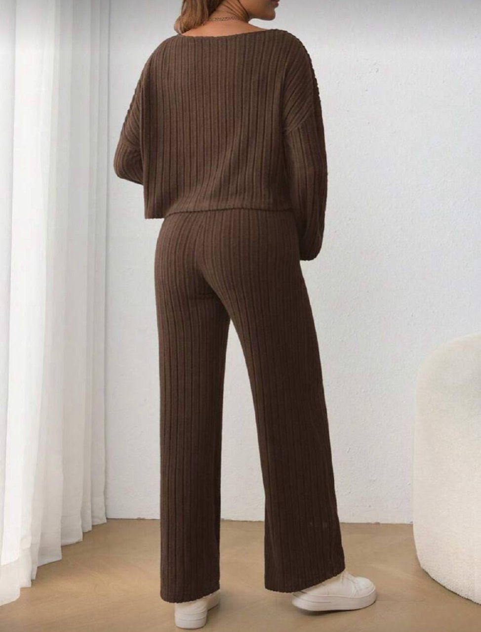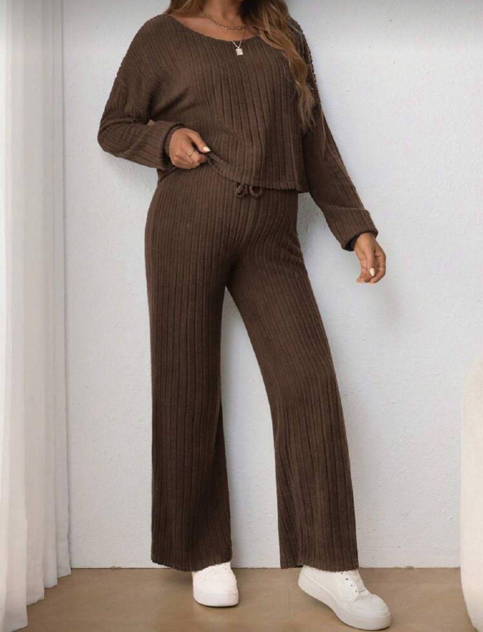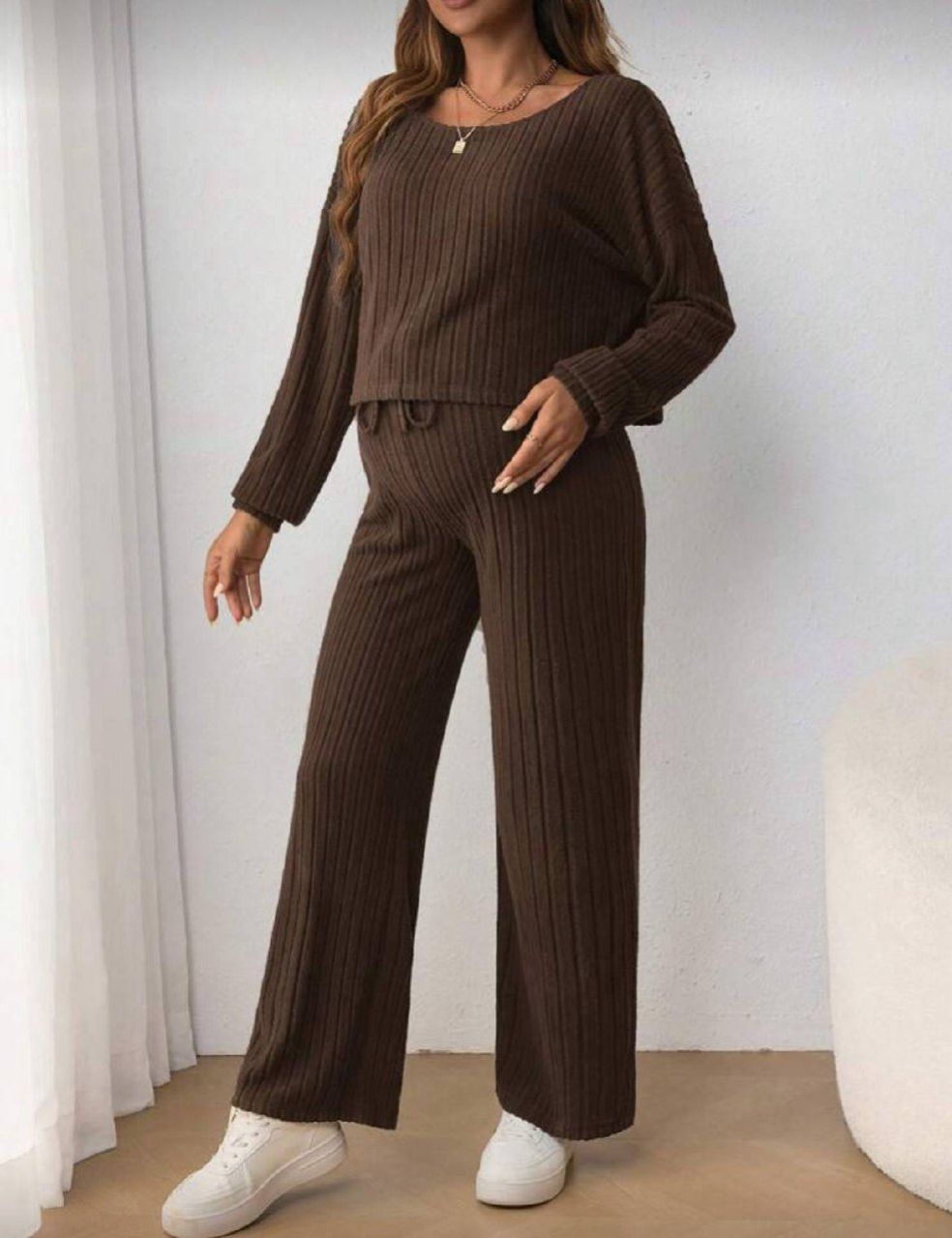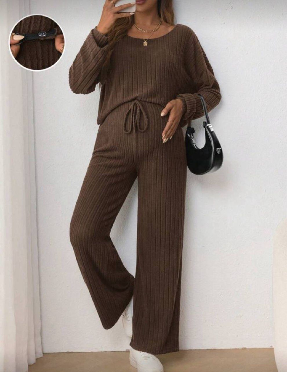 0 Review Of Product SHEIN طقم قطعتين من تي شيرت تيشرت طويل الأكمام بياقة مستديرة وبنطال متسع خصره قابل للتعديل بحزام وربطة