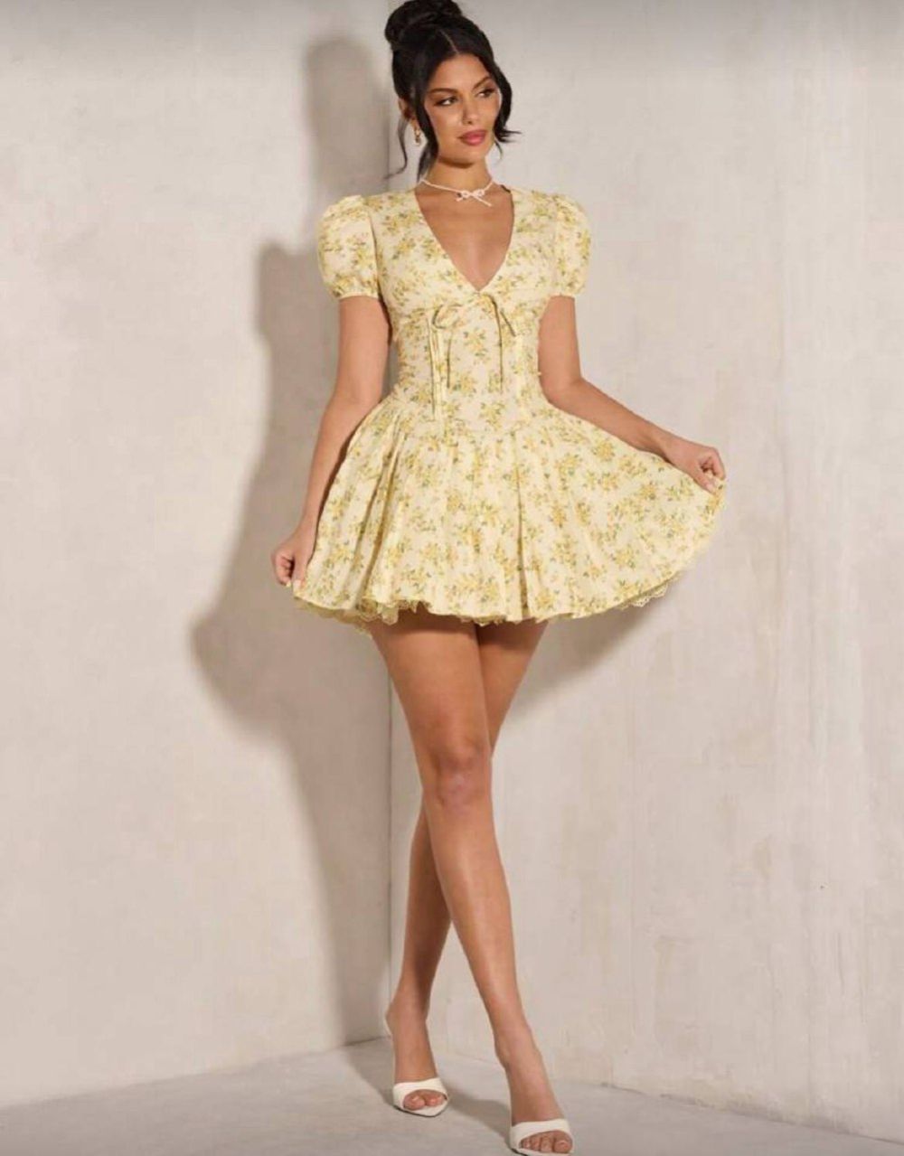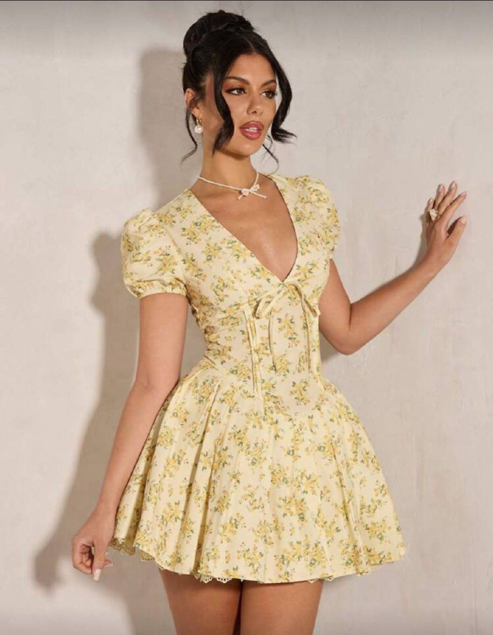 SHEIN BAE فستان مشبك بطبعة زهور صغيرة مع تنورة منسدلة مزينة بالدانتيل، ملابس صيفية للنساء/ملابس ربيعية/ملابس عيد الحب/كرنفال/ملابس عطلة الشاطئ، فساتين باستيل للنساء