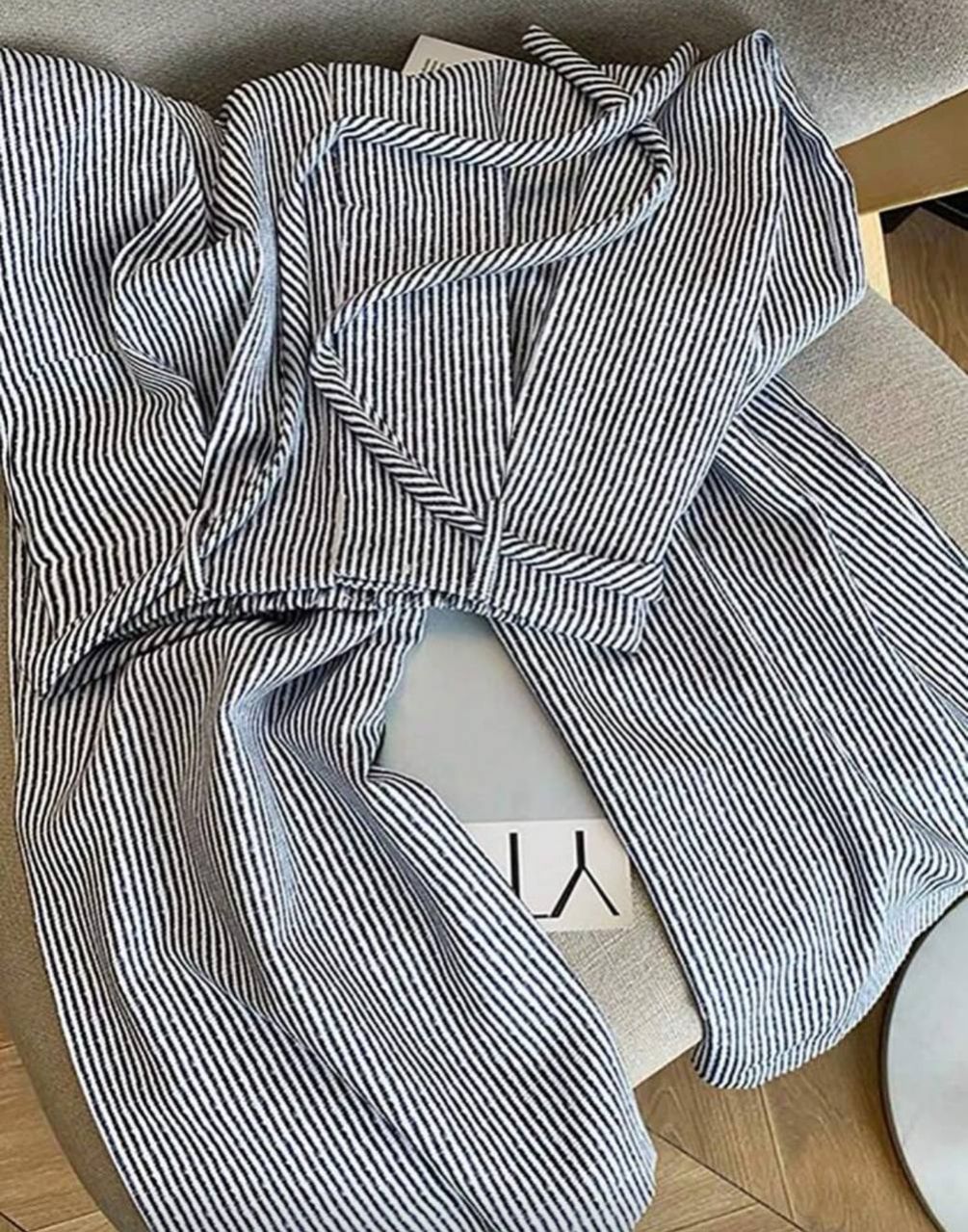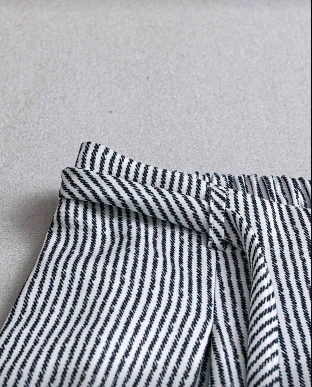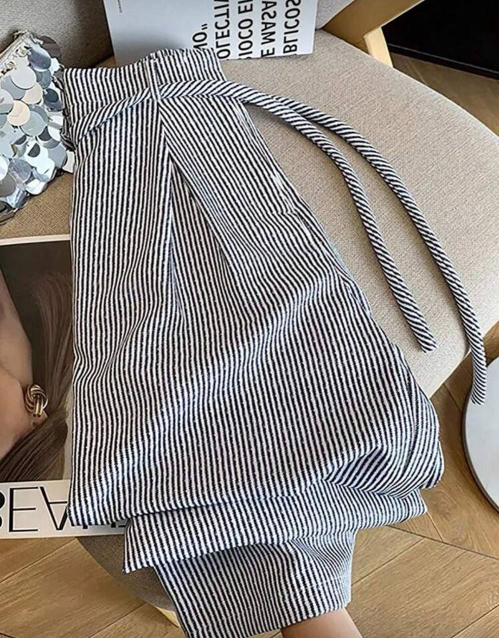 SHEIN PETITE بنطلون نسائي قصير الخصر مخطط بربطة واسع الساق للاستخدام اليومي