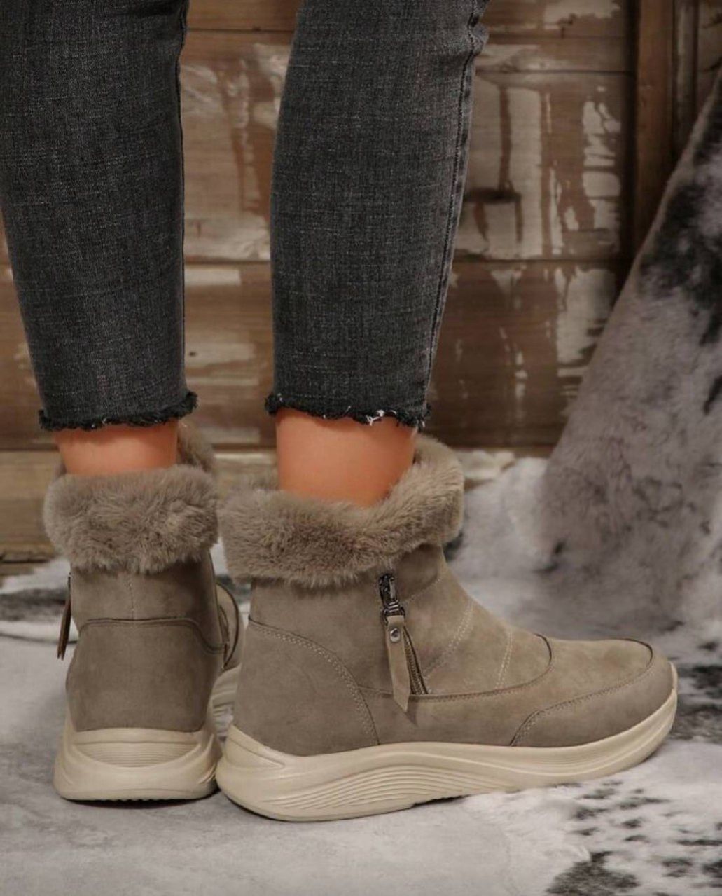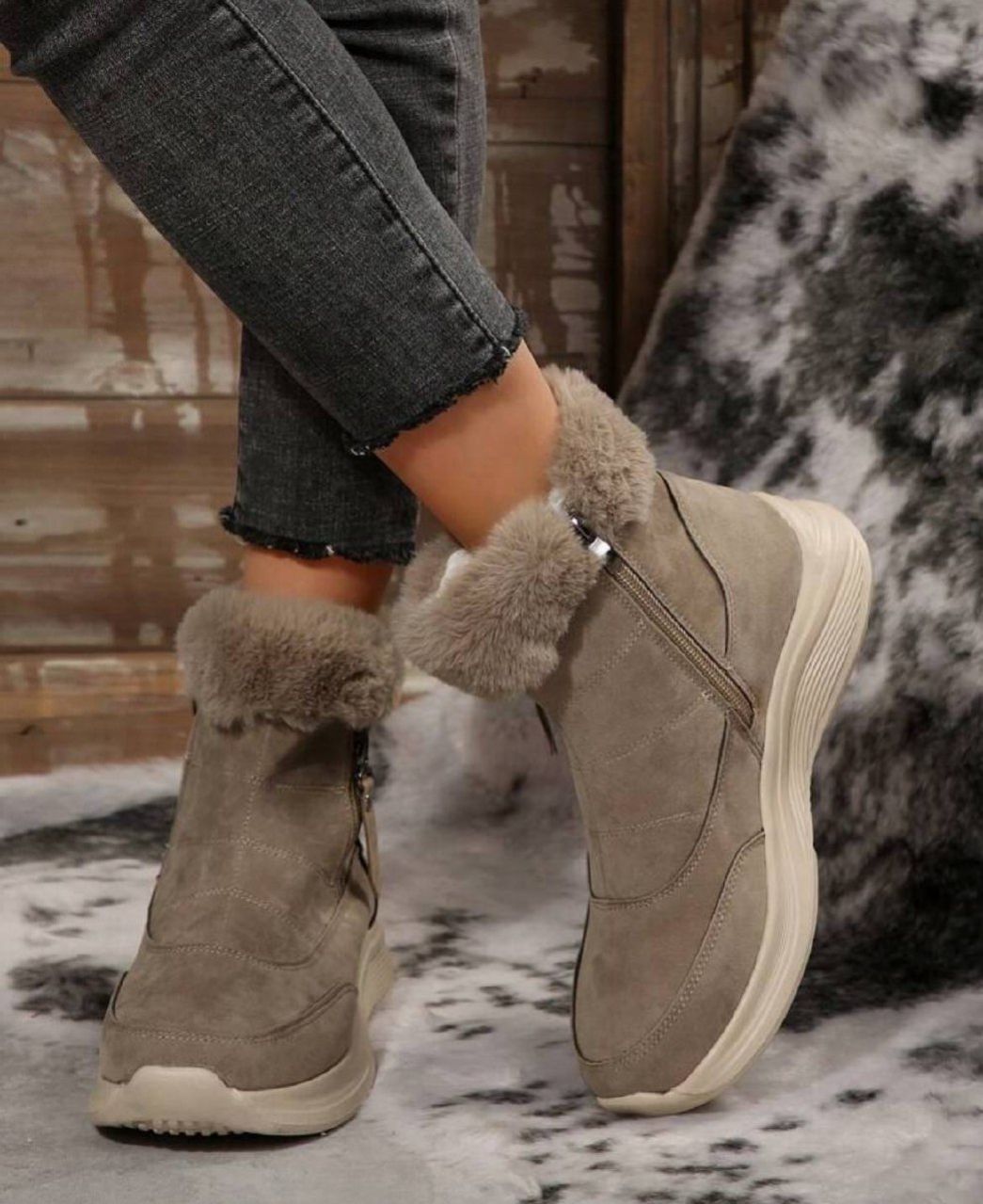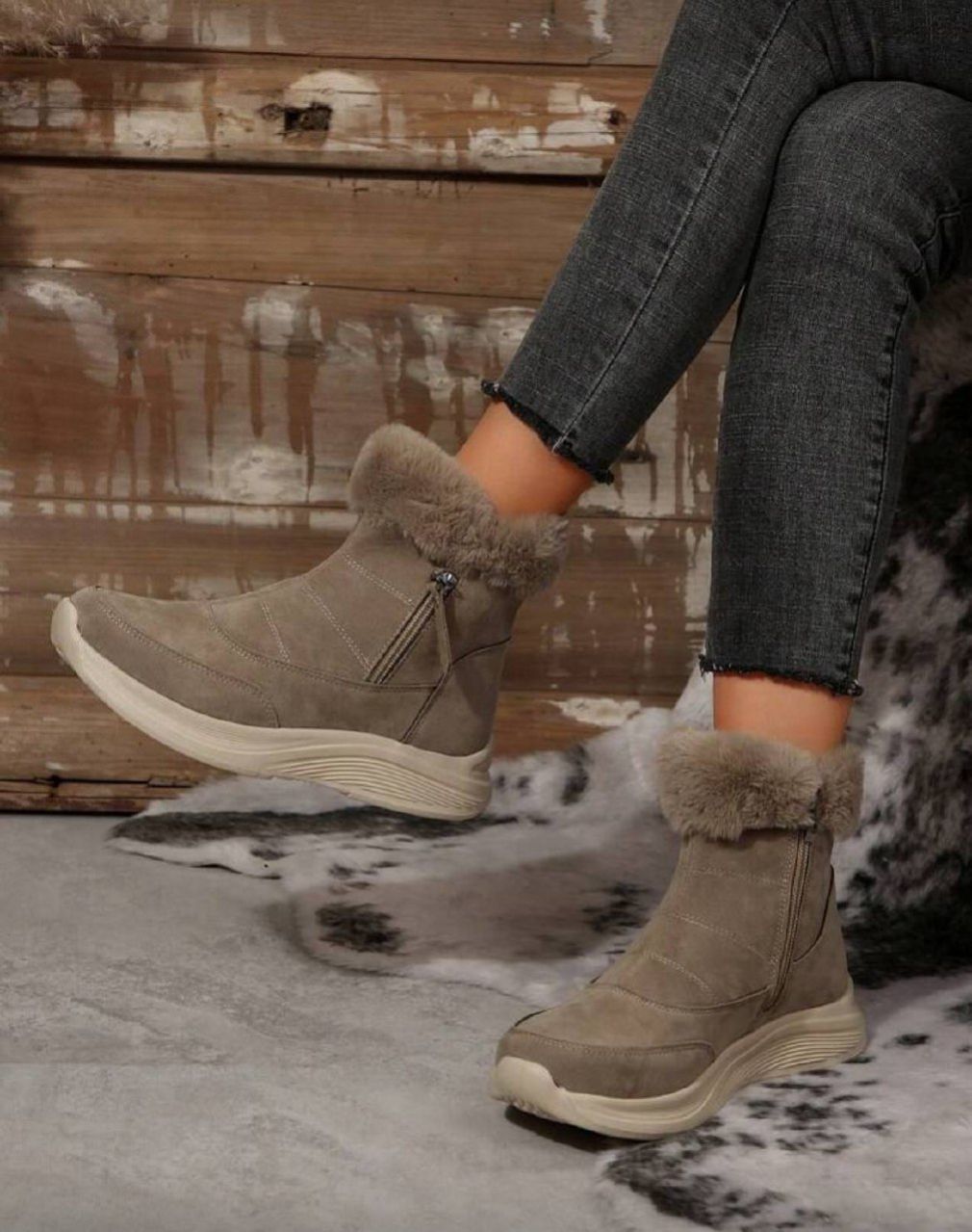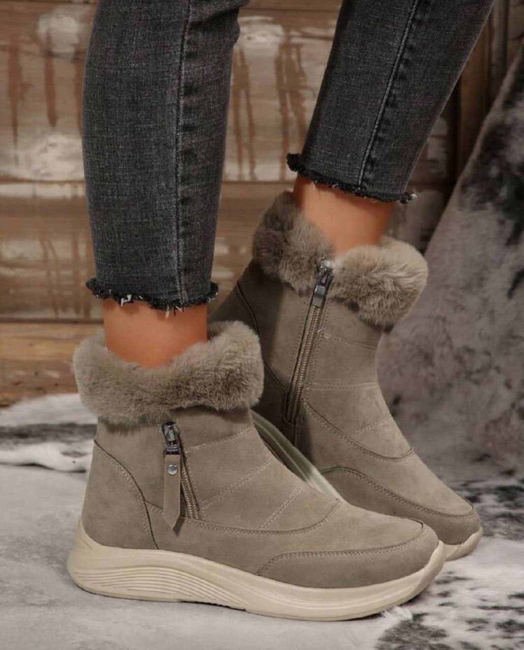 بوت ثلج ناعمة ومريحة للنساء، ذات أصابع مستديرة وأربطة، مانعة للانزلاق وذات كعب منخفض، بوت شتوية بني داكن عصرية دافئة مبطنة بالفرو، بوت فرو