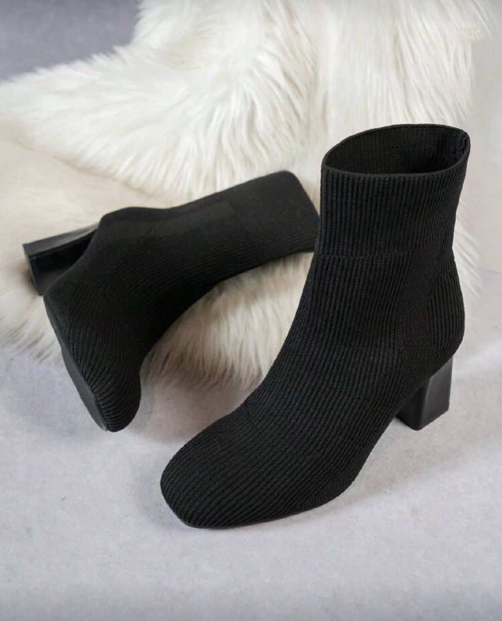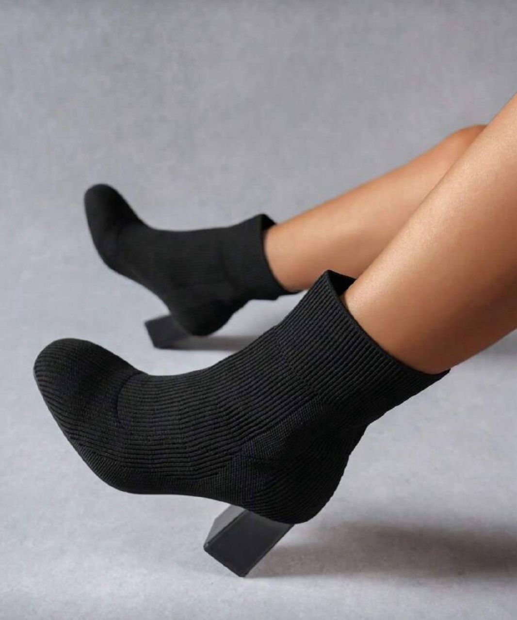 بوت نسائية موديل 2025 جديدة للخريف، بوت كاحل مصنوعة من الأقمشة المنسوجة المرنة، ذات رؤوس مدببة وكعب سميك عالي، بوت جوارب ضيقة ذات لون أسود بسيط مناسبة للحفلات