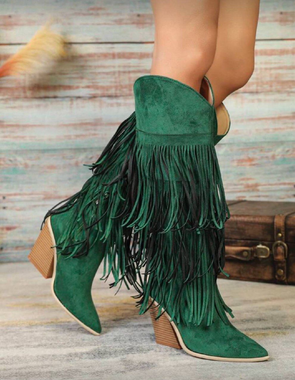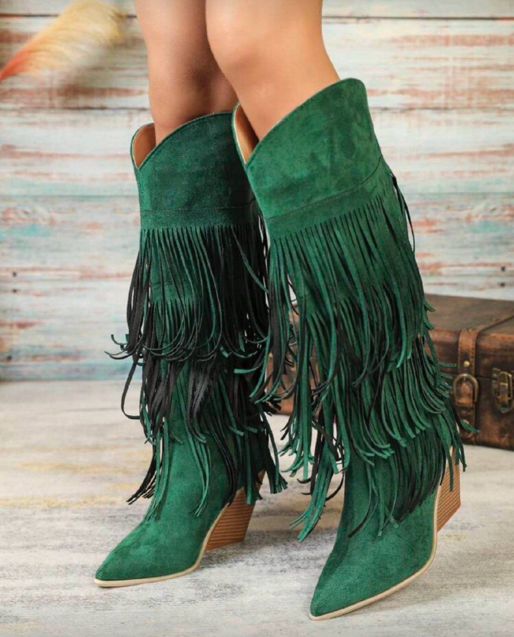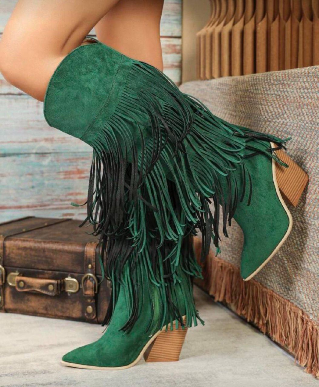 بوت نسائية موضة خريف/شتاء 2025 ذات كعب سميك مريح من الجلد المدبوغ المزيف بطبعة هندسية خضراء وأطراف مهترئة، بوت كاوبوي غربية مريحة ذات كعب عالي بنقشة خشبية وأصابع مدببة