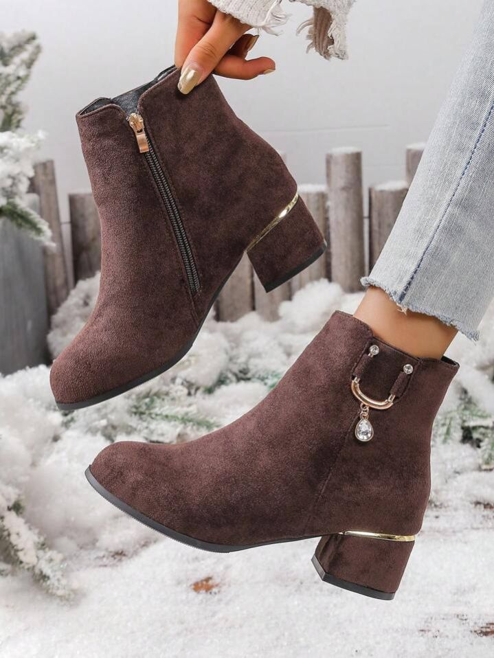 حذاء نسائي قصير باللون البني بكعب متوسط سميك وتصميم بسحاب وقلادة من الكريستال، مثالي للتنسيق مع فستان أسود، عصري وأنيق.