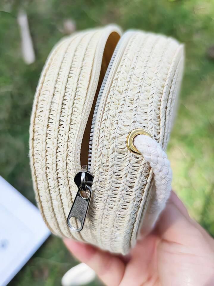 0 Review Of Product حقيبة كتف دائرية صغيرة مزينة بأزهار دوار الشمس، مزودة بحزام عابر، حقيبة شاطئ صيفية منسوجة من القش، حقيبة يد محبوكة للنساء والفتيات والأطفال مع محفظة للنقود