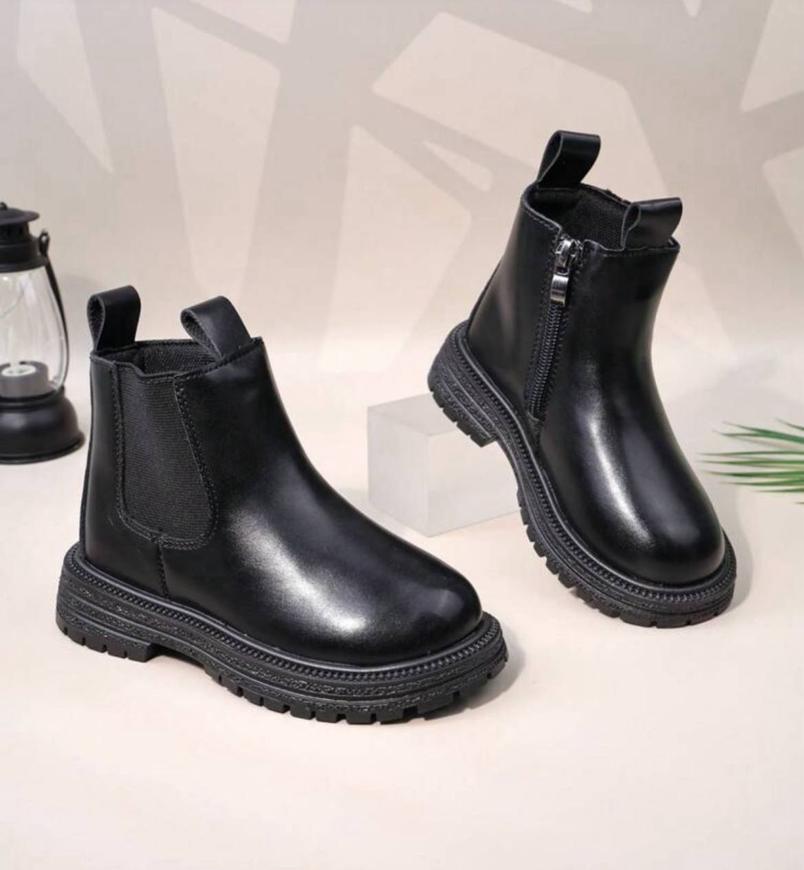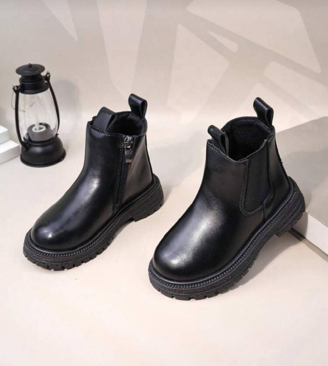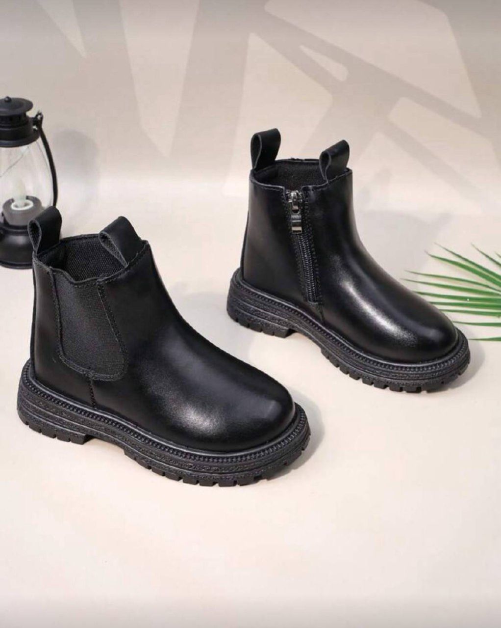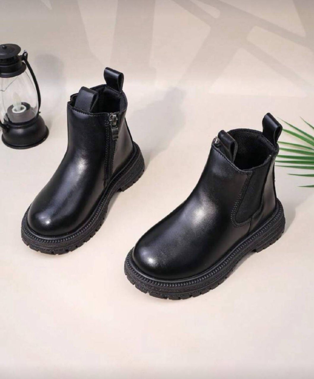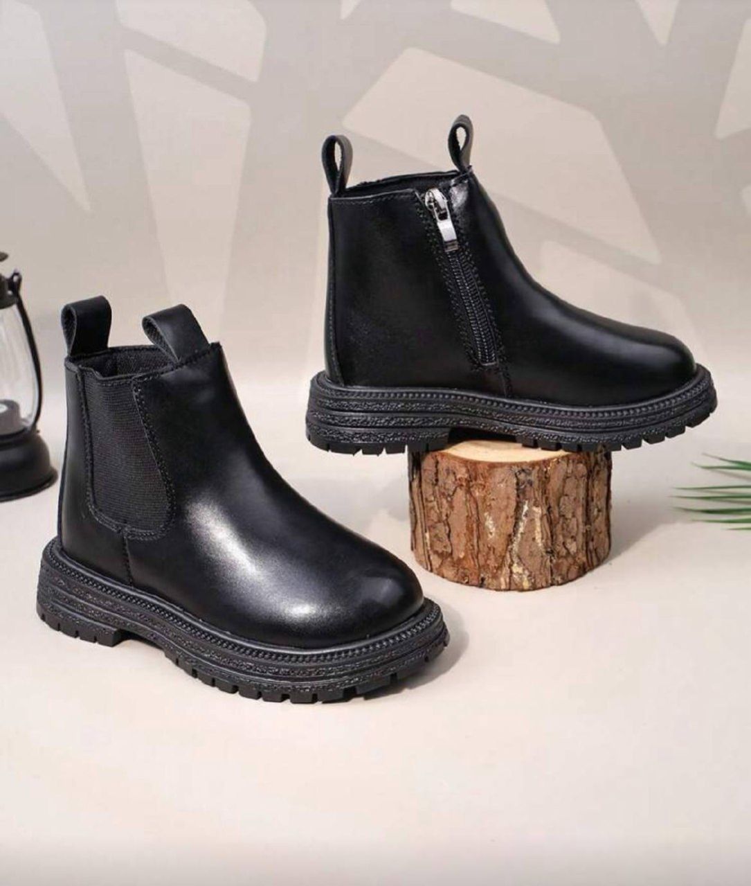 زوج من بوت تشيلسي للأطفال/الأطفال الصغار من الجلد الناعم الأسود والقماش المطاطي، برأس مستدير، وبنعل مانع للانزلاق، أنيقة وجميلة، مناسبة للأولاد والبنات، للاستخدام اليومي، المدرسة، والمناسبات، للخريف والشتاء