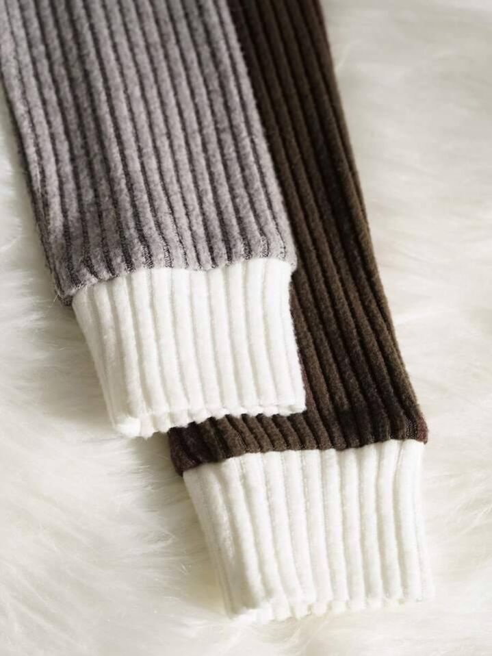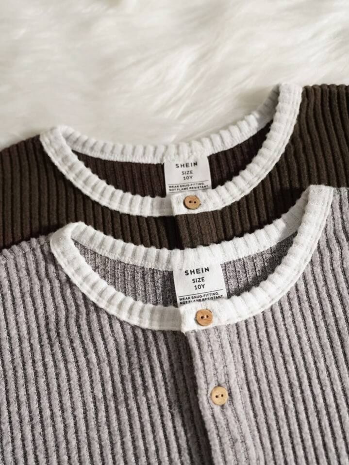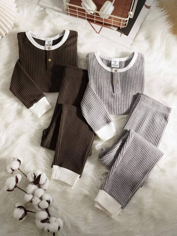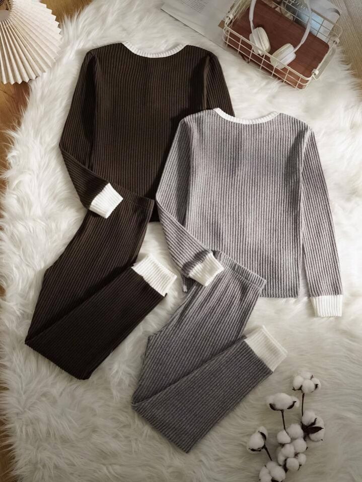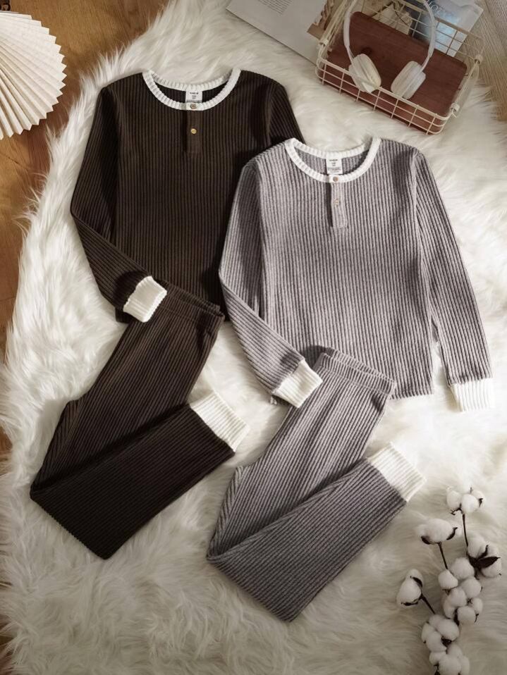 0 Review Of Product طقم بيجامة للمراهقين من SHEIN للأولاد، مكون من 4 قطع، قصة ضيقة، ألوان متباينة، رقبة دائرية، أزرار عند الأكمام والحاشية، بلوزة بأكمام طويلة وبنطلون من الصوف الناعم الدافئ، مناسب للخريف/الشتاء باللون البني