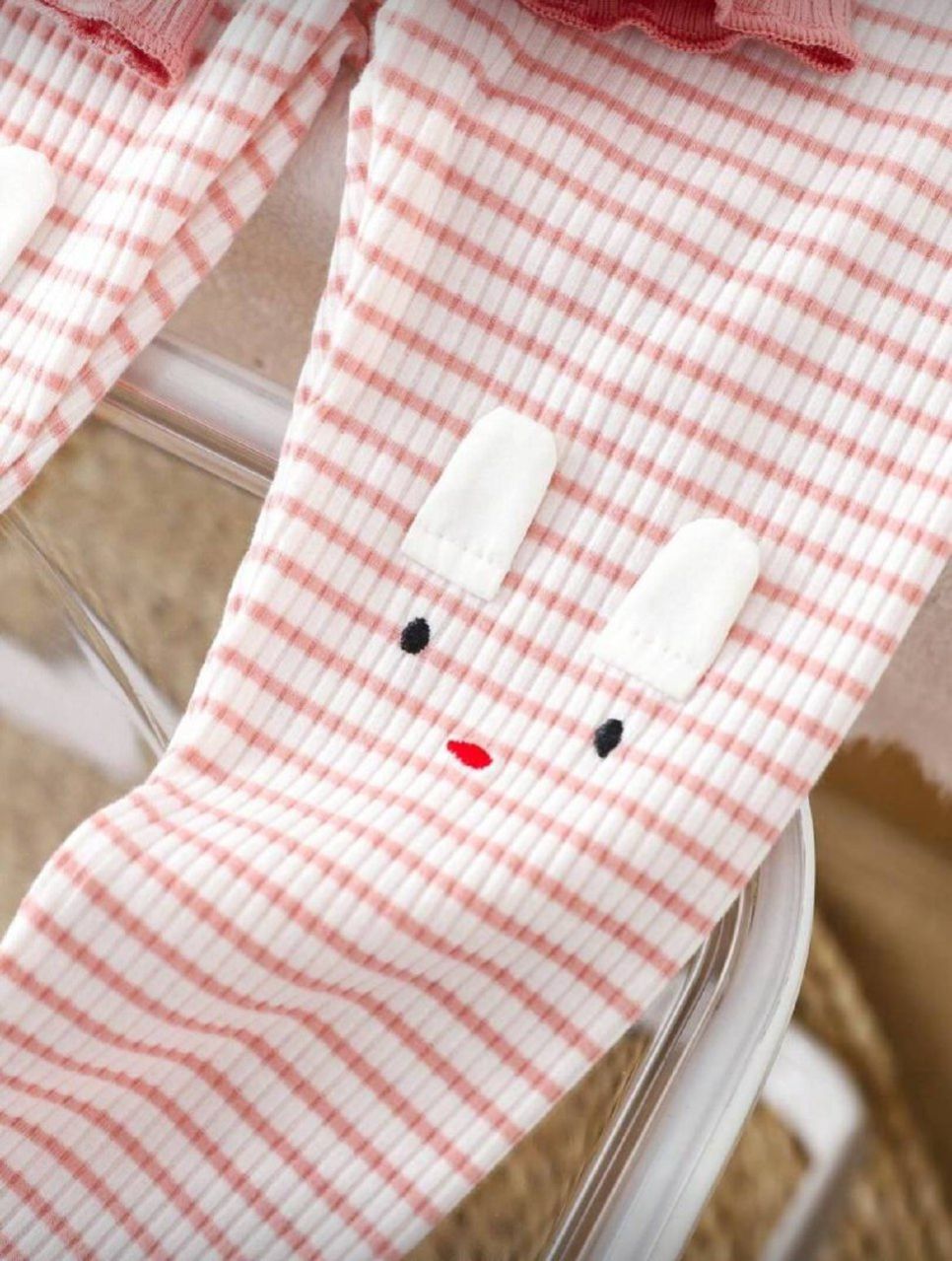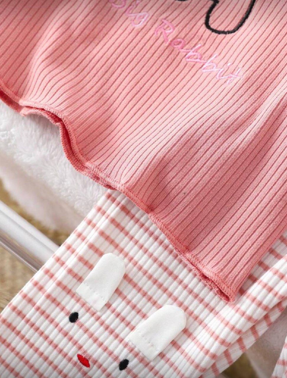 طقم ملابس أساسية شتوية للأطفال البنات، ملابس علوية طويل الأكمام رقبة طاقم وبطبعة أرنب مطرزة،و بنطلون مخطط، مريح لتناسب الخريف والشتاء