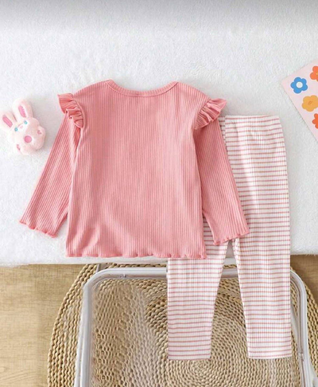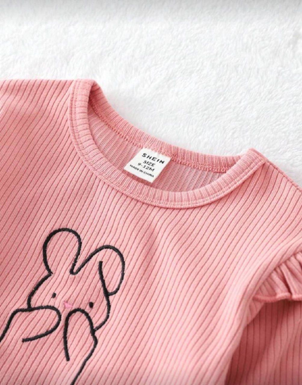 0 Review Of Product طقم ملابس أساسية شتوية للأطفال البنات، ملابس علوية طويل الأكمام رقبة طاقم وبطبعة أرنب مطرزة،و بنطلون مخطط، مريح لتناسب الخريف والشتاء