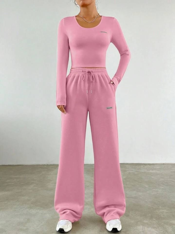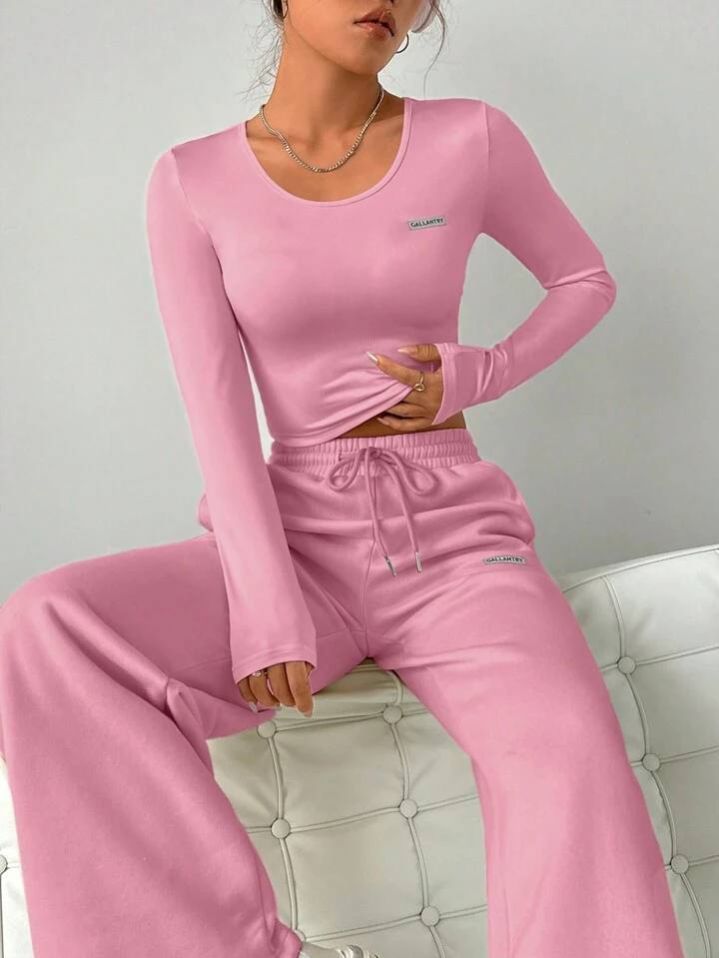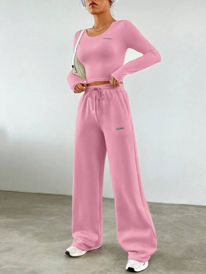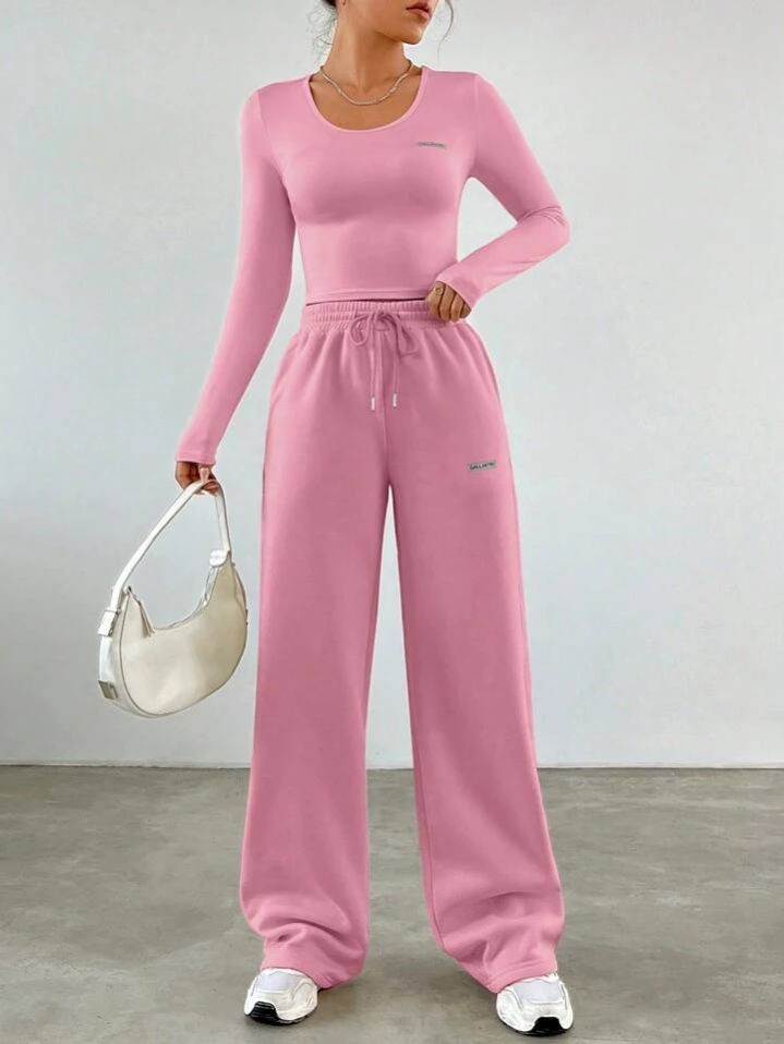 طقم من قطعتين من SHEIN EZwear للنساء، تيشيرت مطبوع عليه حروف وبنطلون برباط خصر