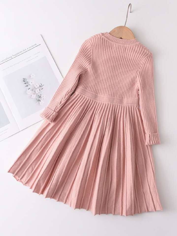فستان محبوك كاجوال بسيط بأكمام طويلة وثنيات مناسب لفصل الخريف والشتاء لفتاة صغيرة