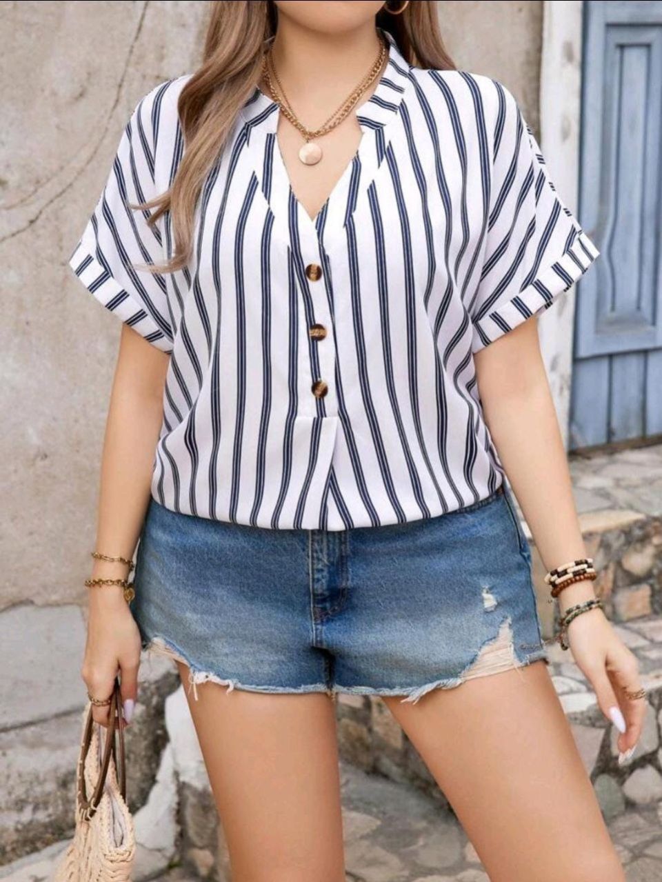 قميص نسائي كاجوال مخطط بأكمام قصيرة ورقبة على شكل حرف V من SHEIN LUNE بمقاسات كبيرة