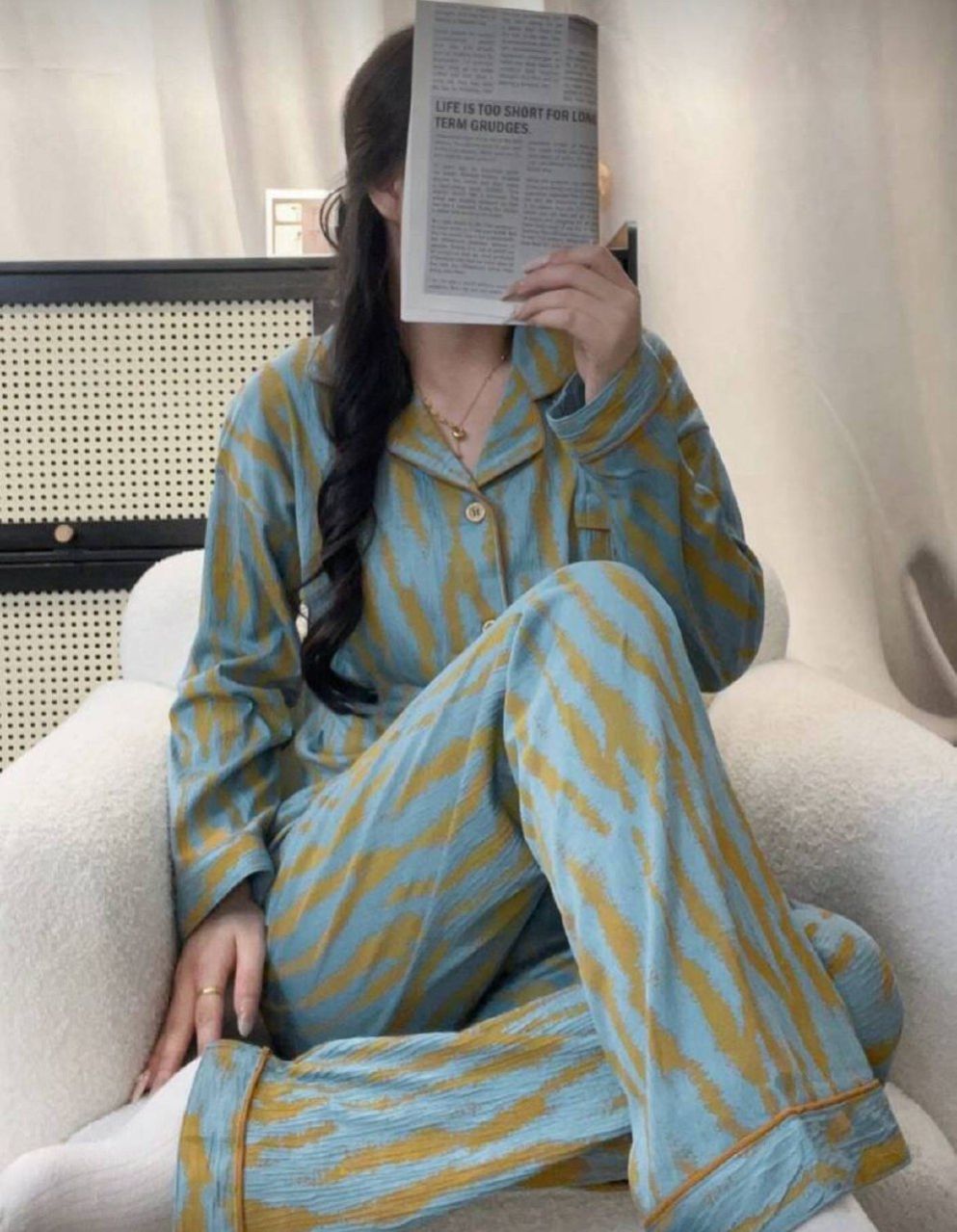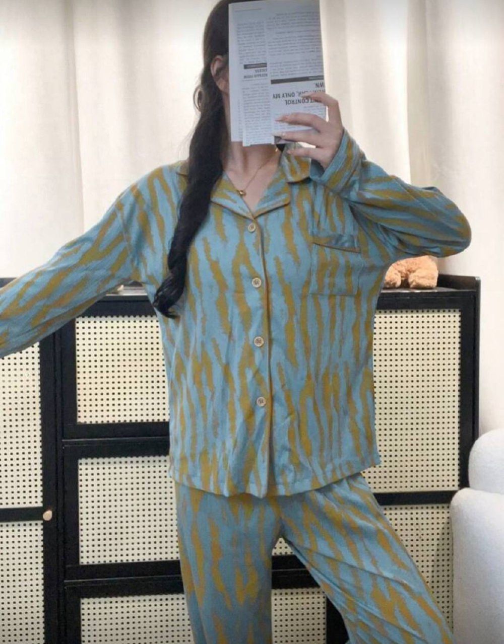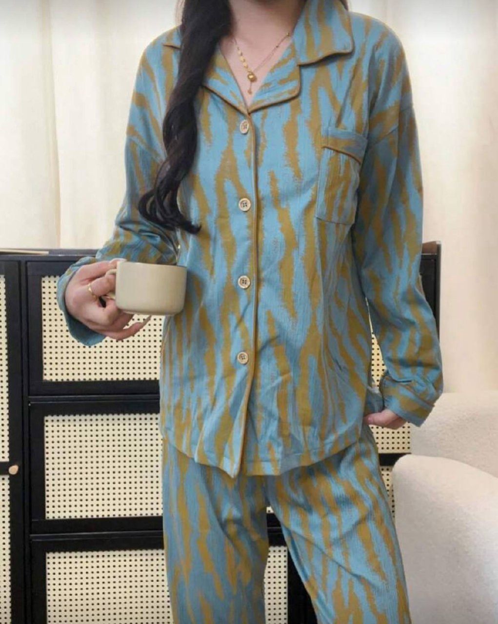 مجموعة بيجامة للنساء تتكون من ملابس علوية كم طويل مفتوحة بأزرار وبنطال، مصممة بشريط غير متماثل، أناقة وأزياء عصرية للاستخدام اليومي، مجموعة قطعتين، ملابس خريفية