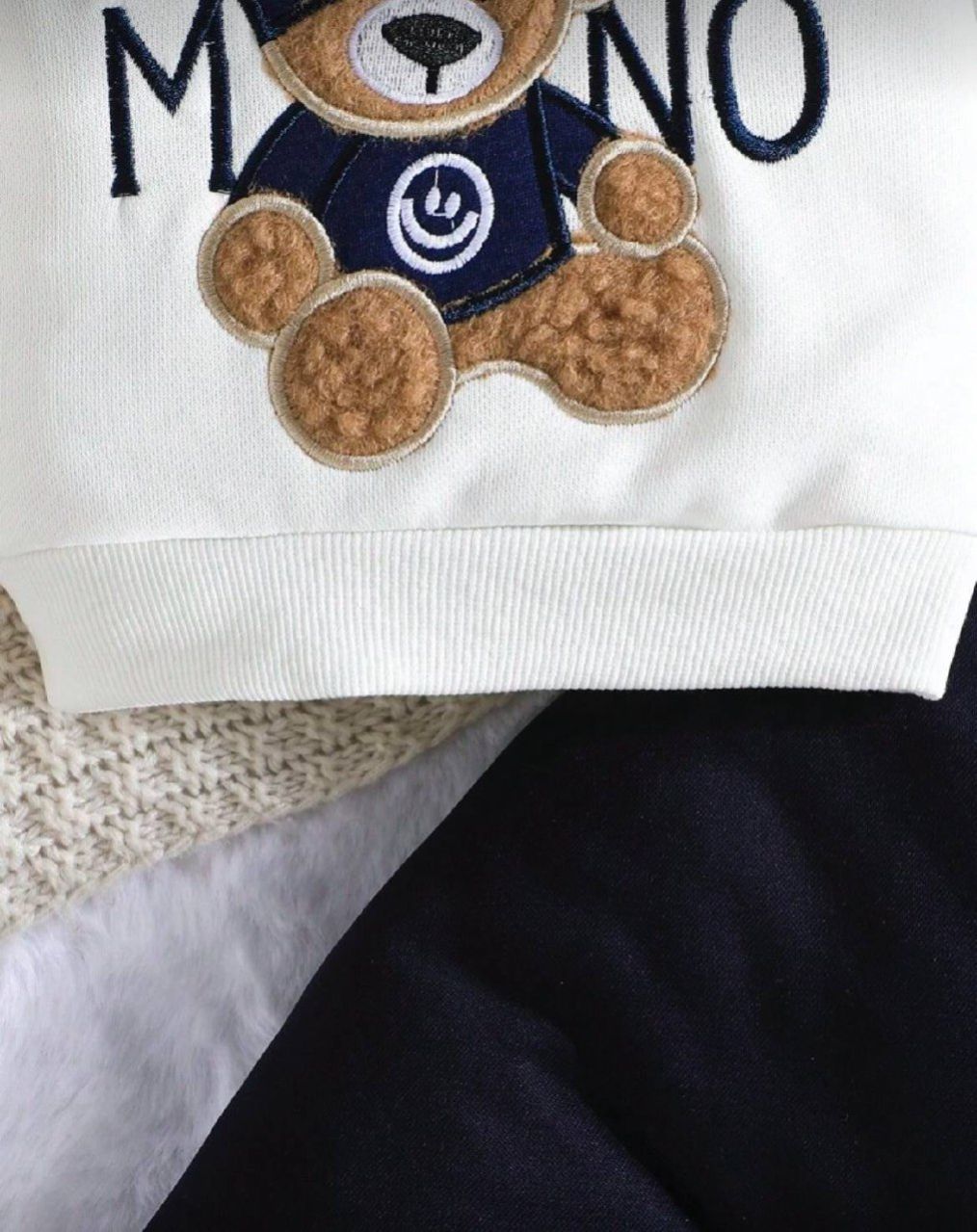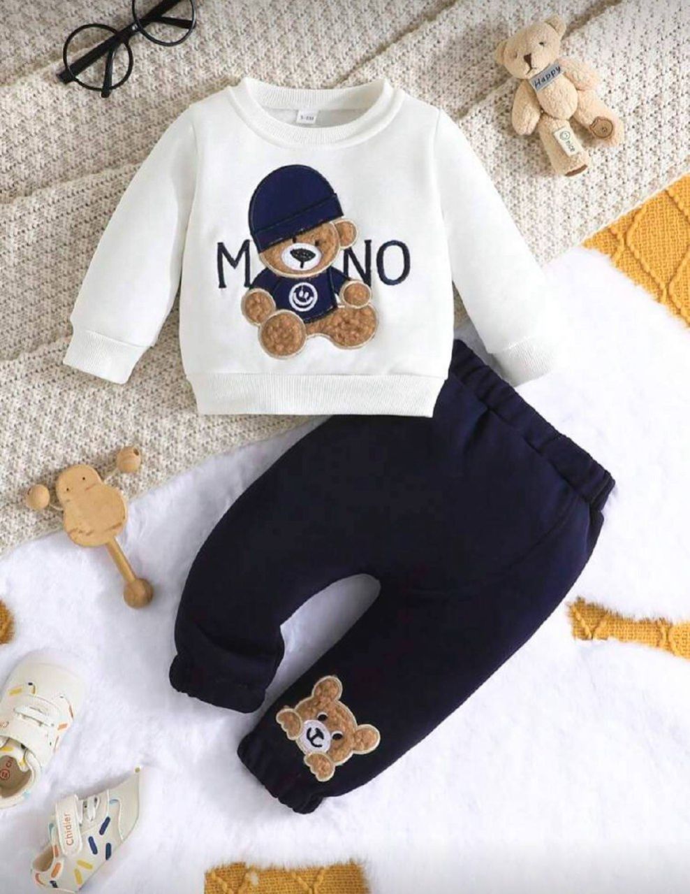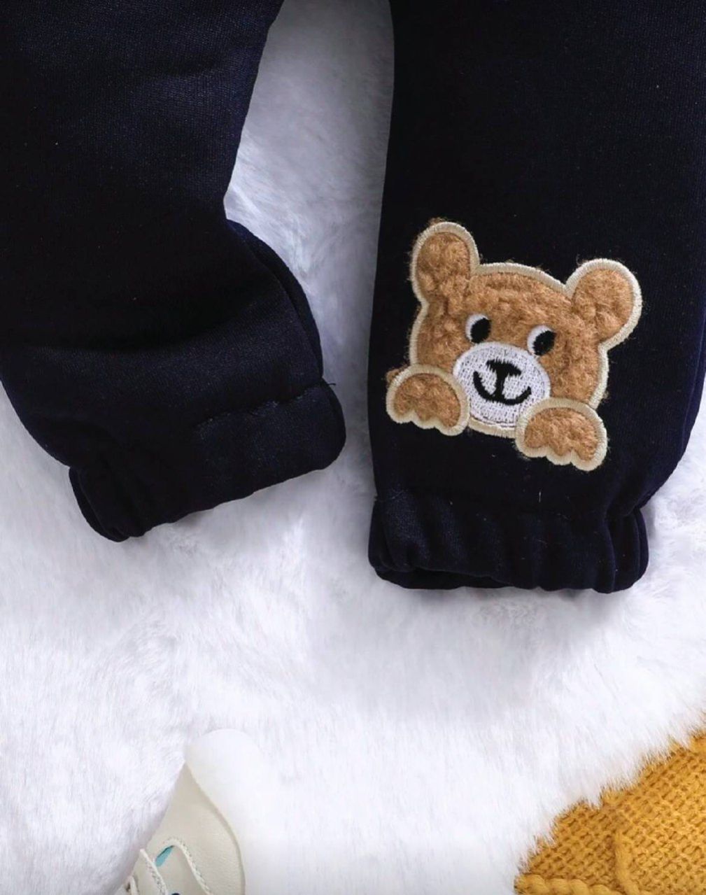 مجموعة ملابس علوية كم طويل وبنطال طويل لون أساسي بتصميم الدب الكرتوني للأولاد الرضع، خريف/شتاء، قطعتان