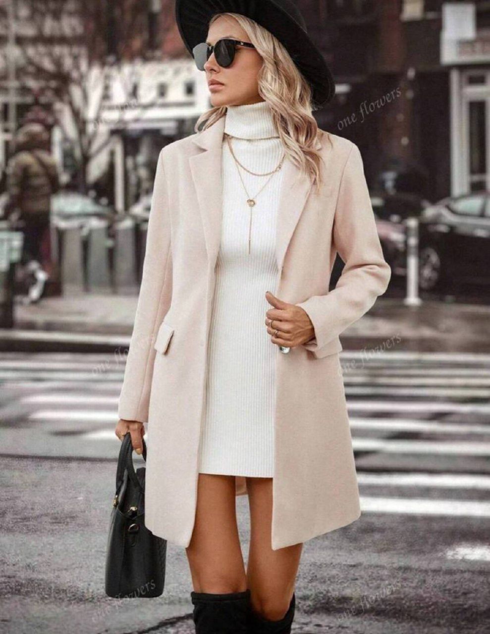 معطف كارديجان طويل بأكمام طويلة وأزرار أمامية، لون أحادي، مع طوق وتفاصيل أزرار، مصنوع من قماش محبوك قليل المرونة، مناسب للخريف والشتاء