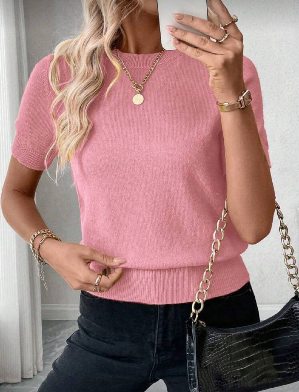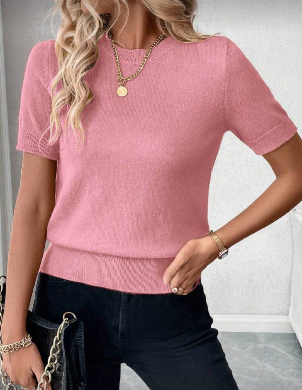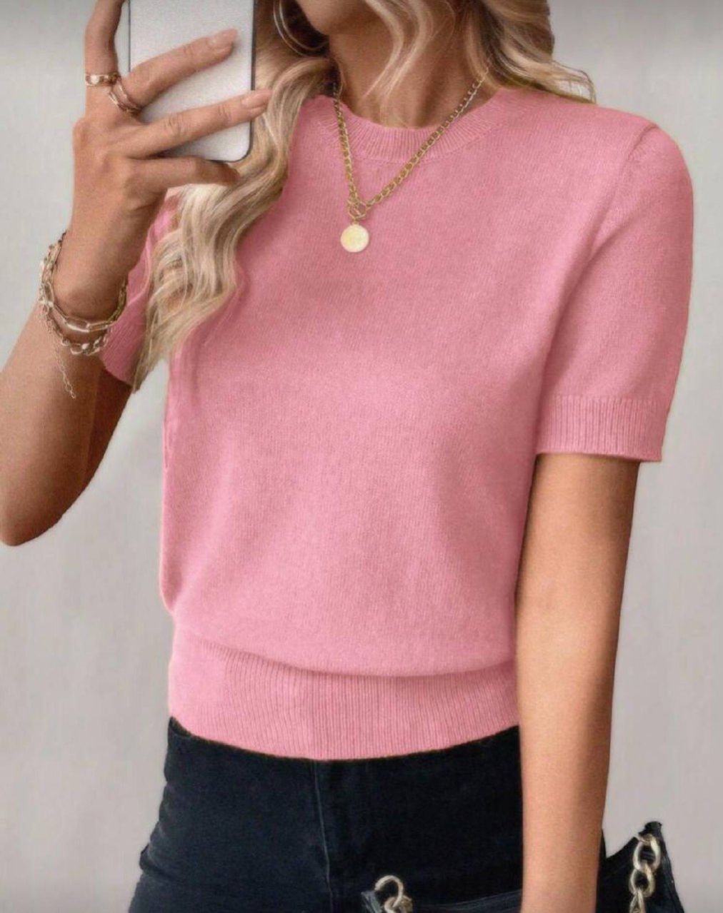 Calvaya ملابس علوية محبوكة كاجوال للنساء ذات لون أحادي وياقة مستديرة وأكمام قصيرة