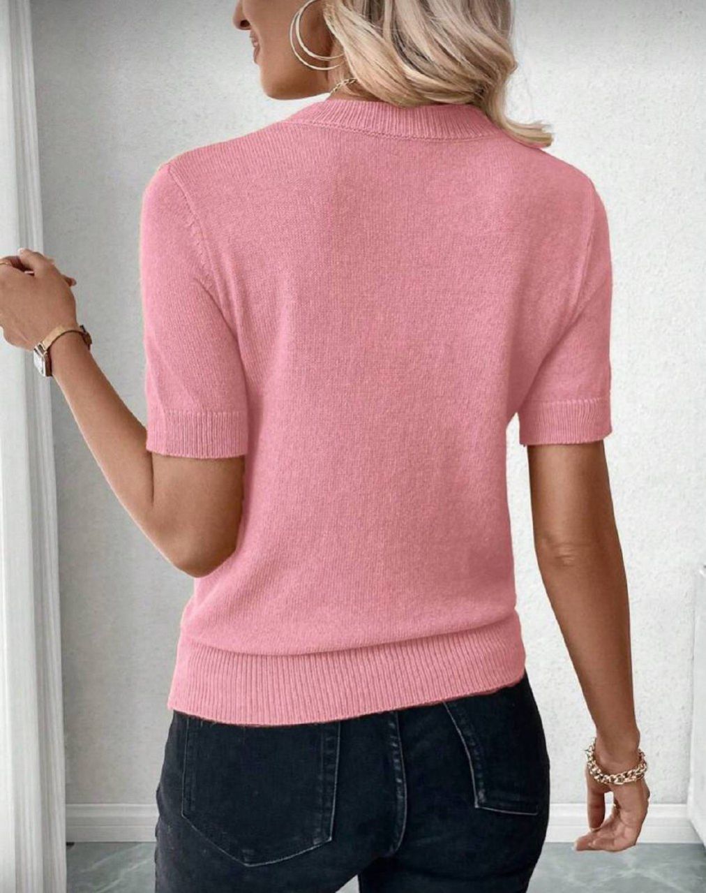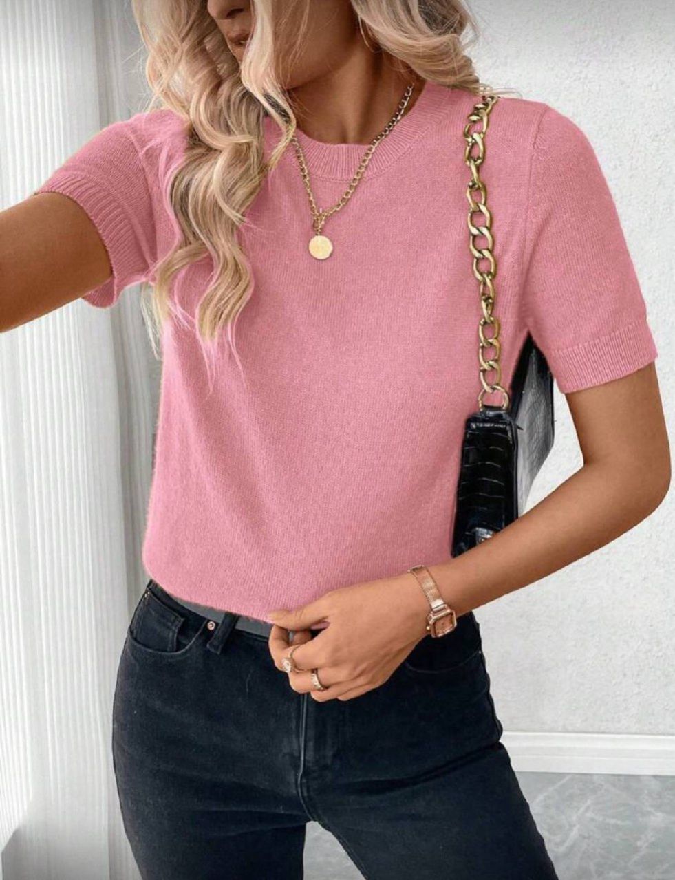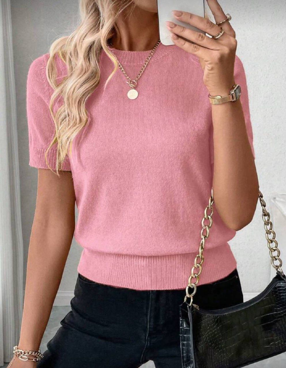 Calvaya ملابس علوية محبوكة كاجوال للنساء ذات لون أحادي وياقة مستديرة وأكمام قصيرة