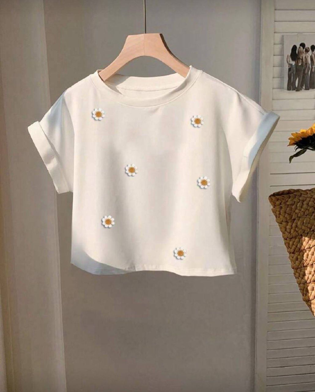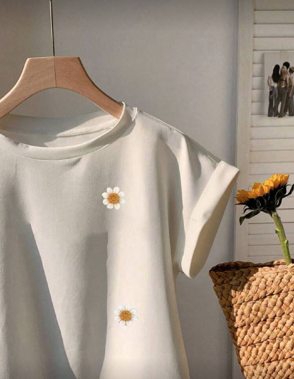 Comfortcana تي شيرت نسائي أنيق وبسيط بطرز زهور البابونج مرتخي بياقة مستديرة وأكمام قصيرة، مناسب للبس اليومي والحفلات في الصيف