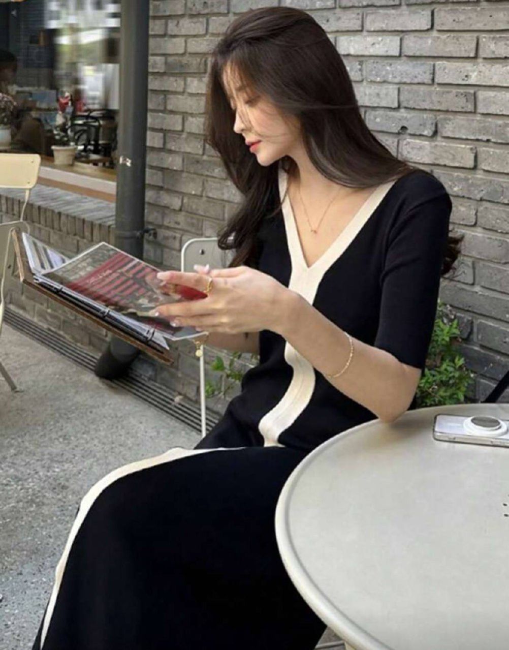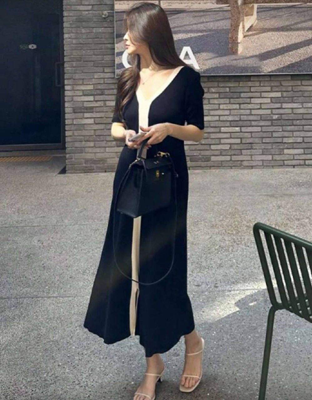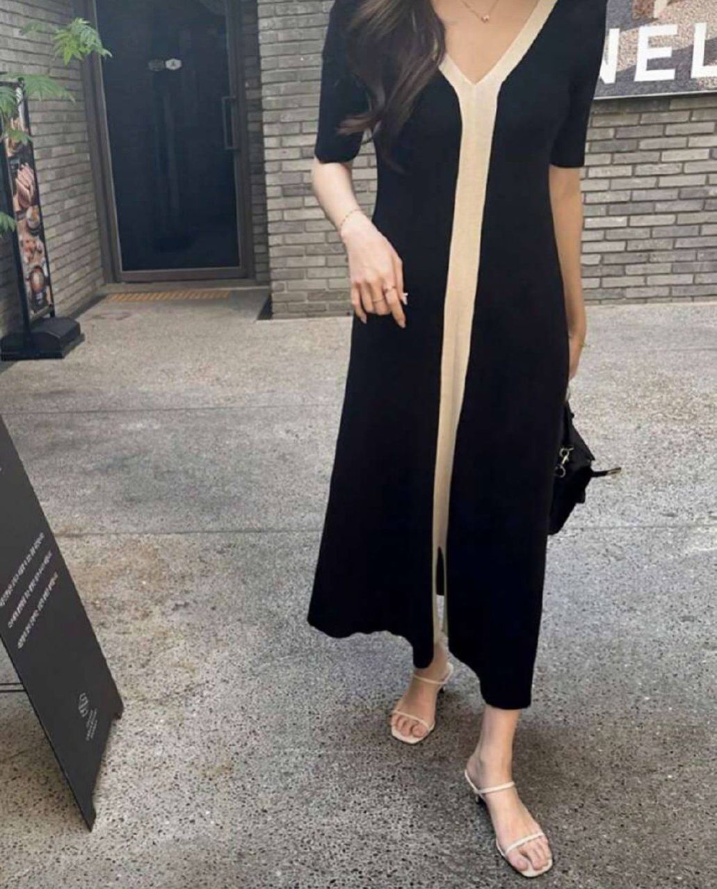 0 Review Of Product DAZY فستان كنزة صوفية بياقة على شكل حرف V وتقسيمة في الذيل، ملابس للعودة إلى المدرسة في فصل الخريف/الشتاء