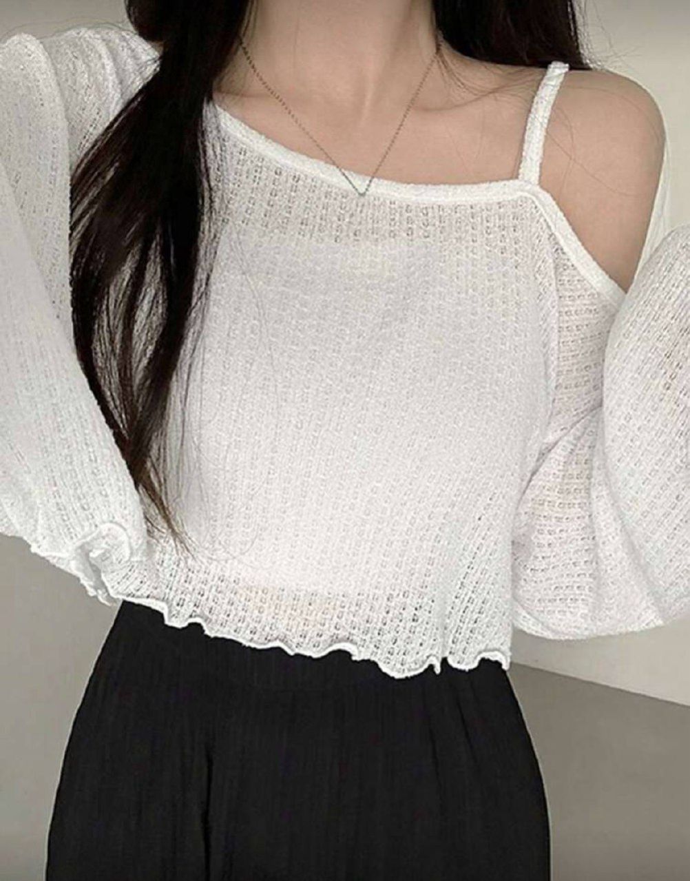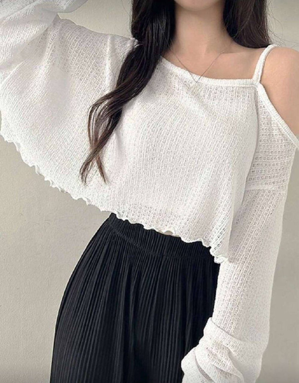 DAZY قميص قصير نسائي كاجوال بكتف مائل وذيل غير متماثل، بلوزة نسائية طويلة الأكمام للخريف، ملابس نسائية للخريف، بلوزة قصيرة نسائية