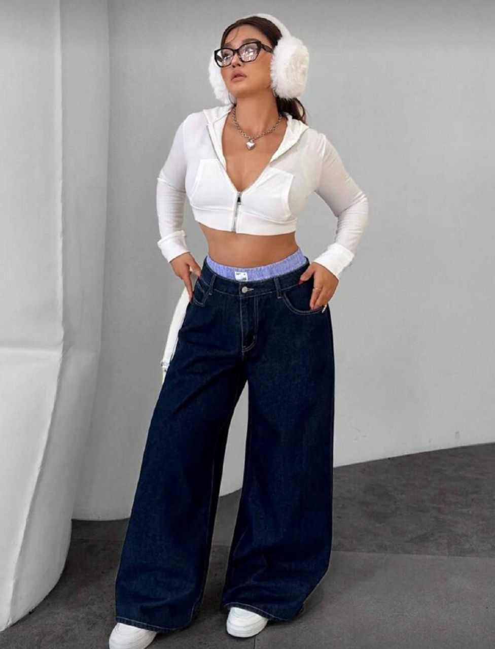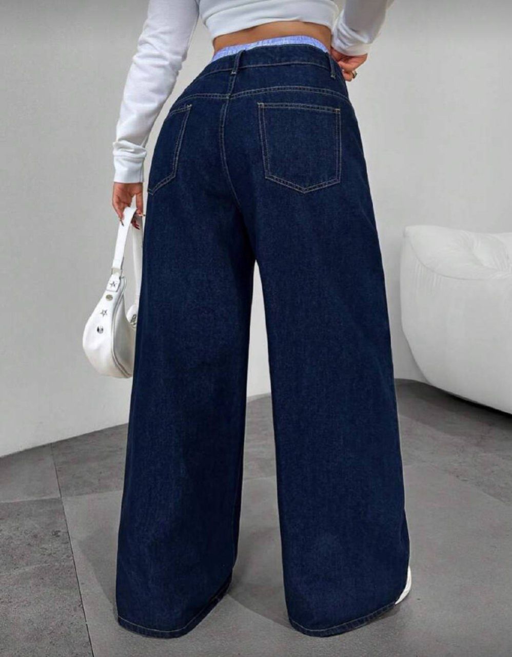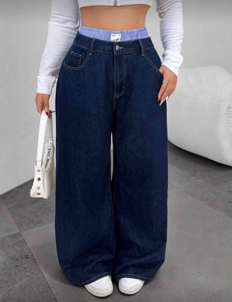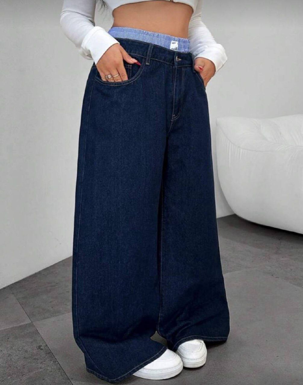 Dripcurv بنطلون جينز مستقيم الساق بتصميم رقعي باللون الأزرق للمرأة البدينة، بأسلوب كاجوال شارع مع لمسة أنيقة، مثالي لإطلالات رأس السنة الجديدة.