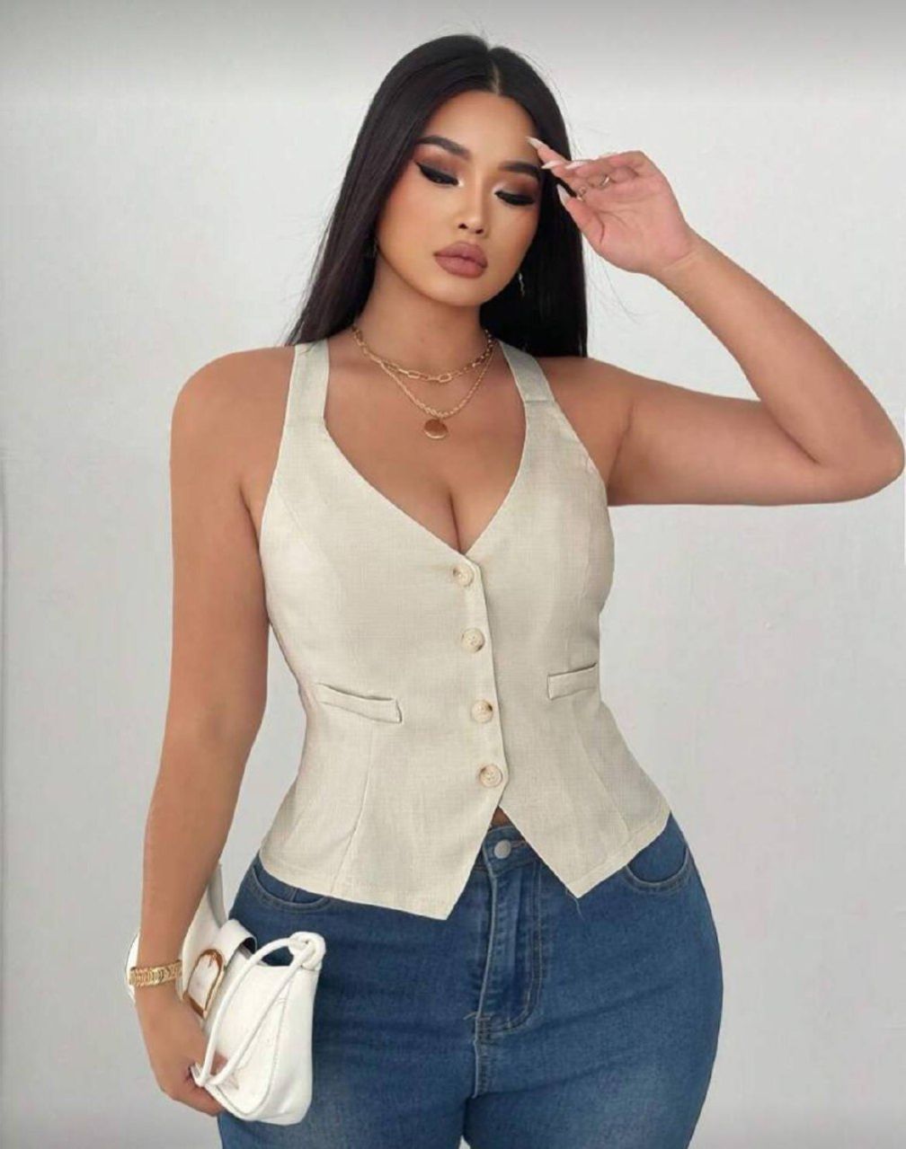 0 Review Of Product Elenzga قميص قطن باللون الواحد مع وسط ممسوك للسيدات ذوات الحجم الكبير