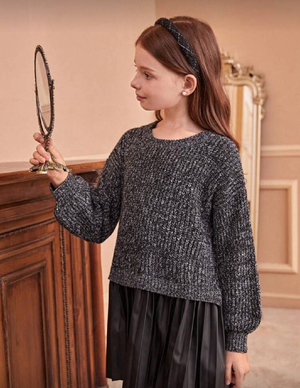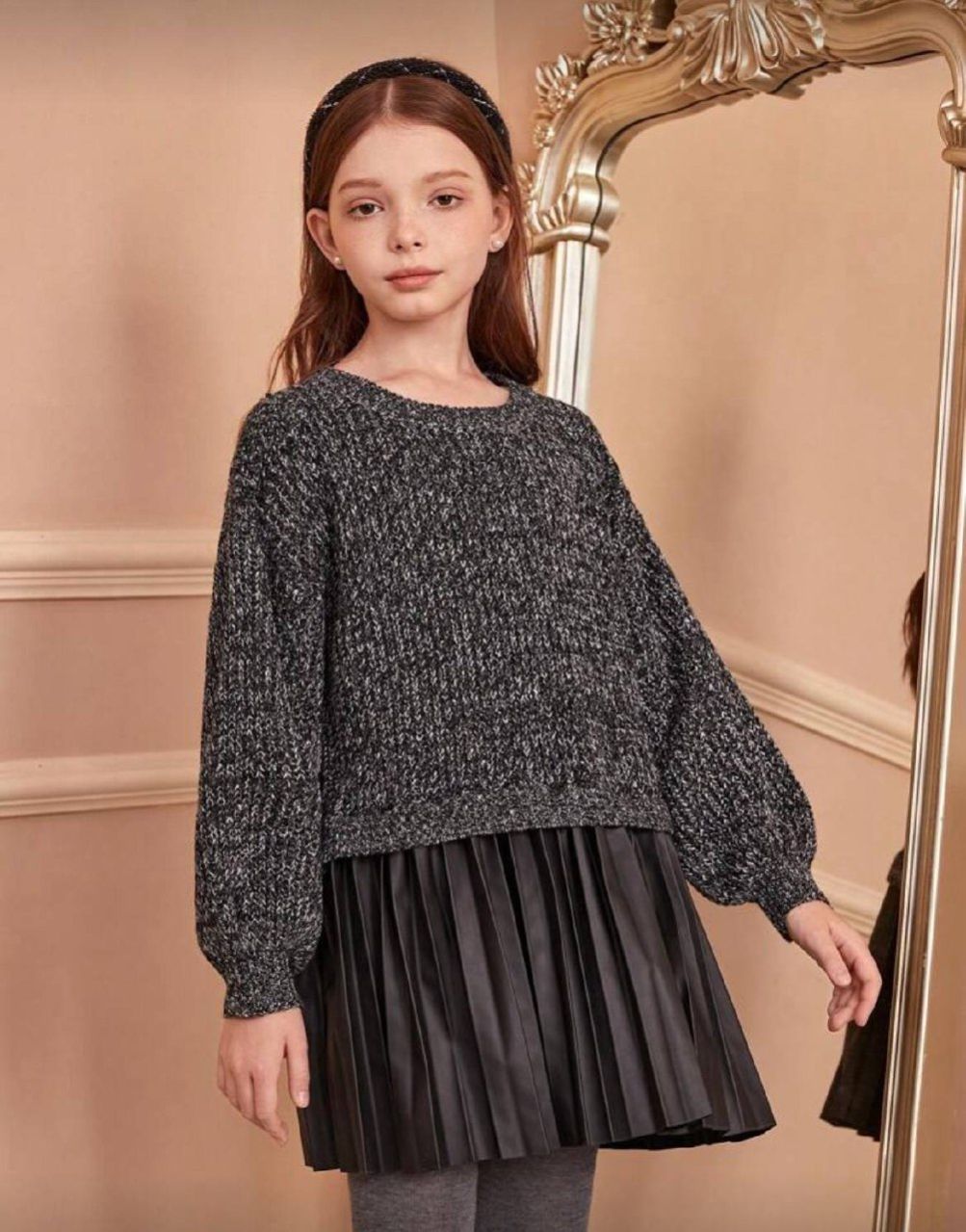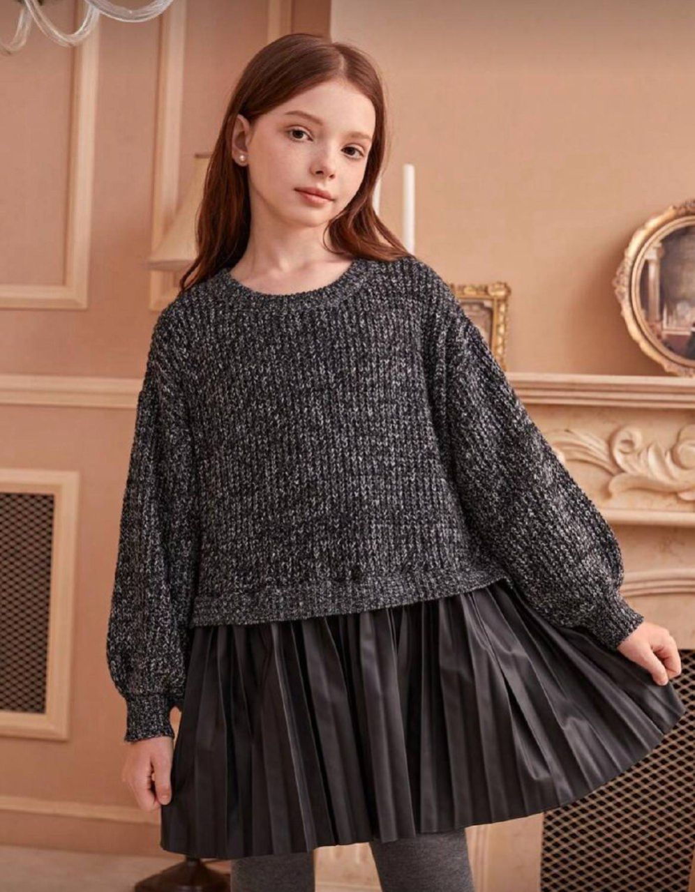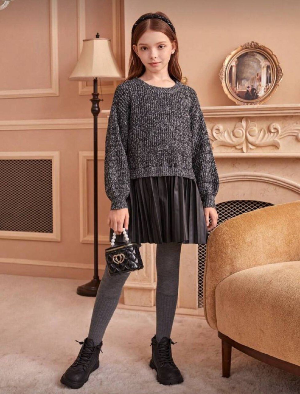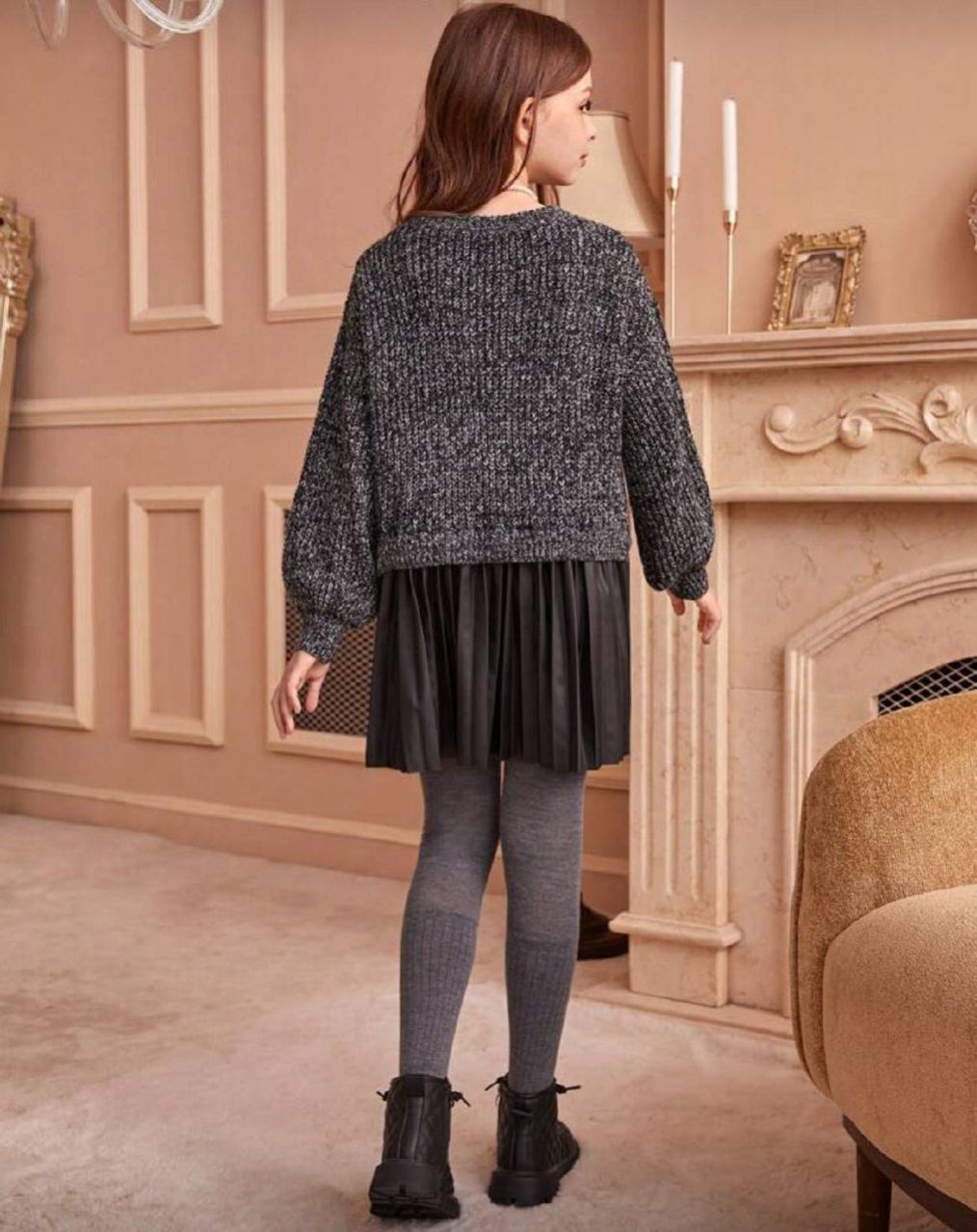 SHEIN فستان كنزة صوفية مُحبوك للفتيات المراهقات في فصل الخريف والشتاء وأعياد الميلاد وحفلات الهالوين. بألوان أسود ورمادي مع إيحاءات، وتقنية حياكة فريدة. تُظهر تقنية الحياكة سحرًا شخصيًا وحيويًا أنيقًا، مما يرفع من الشعور بالجودة الإجمالية. قماش ناعم للدفء والراحة على البشرة. يتميز الفستان بالتصميم المرقع مع خامة شبيهة بالجلد من البولي يوريثان، مما يُظهر حرفية مدروسة. مناسب للارتداء لفترات طويلة، مريح وطبيعي. مثالي للمدرسة والخروجات والحفلات وحفلات الهالوين وما إلى ذلك.'