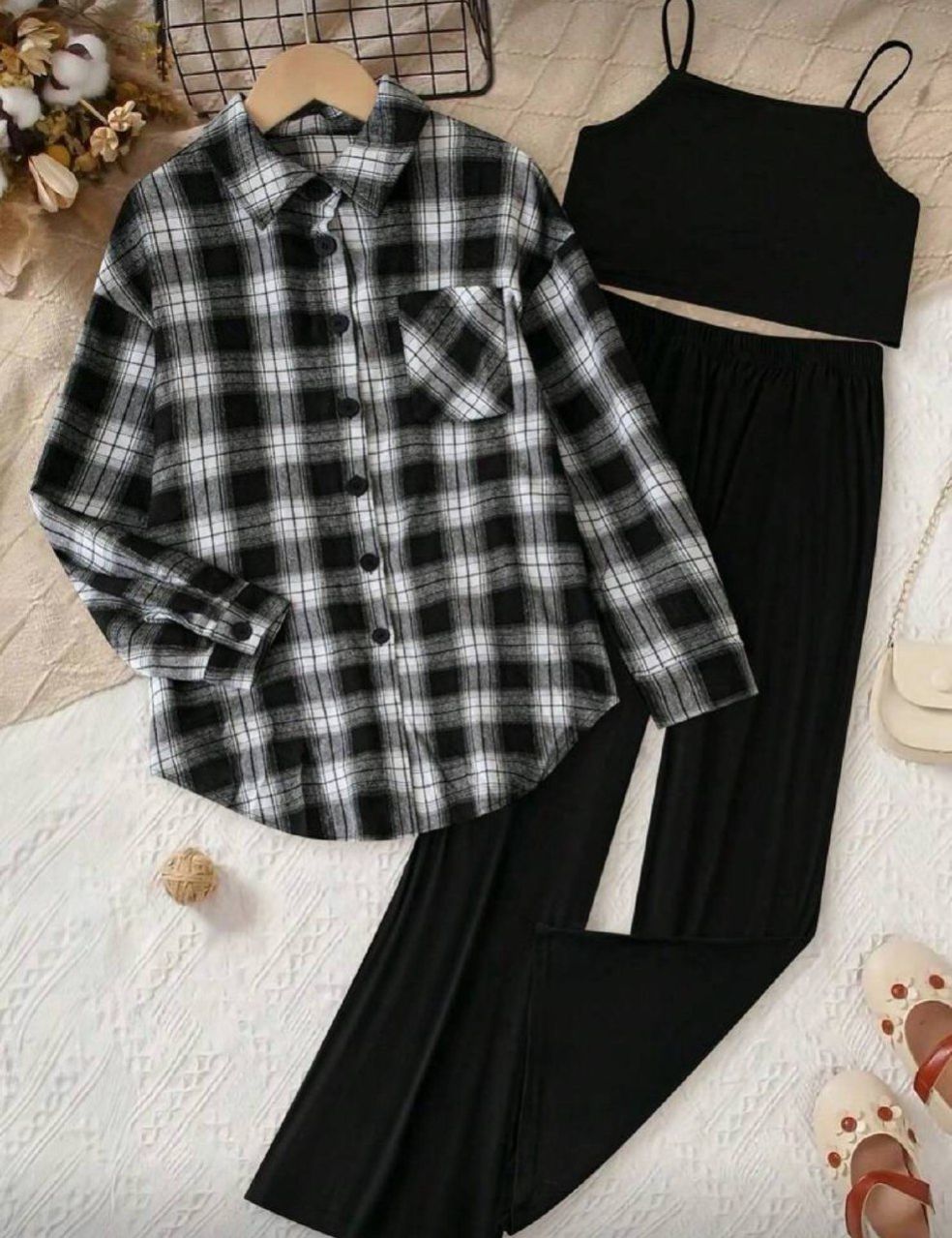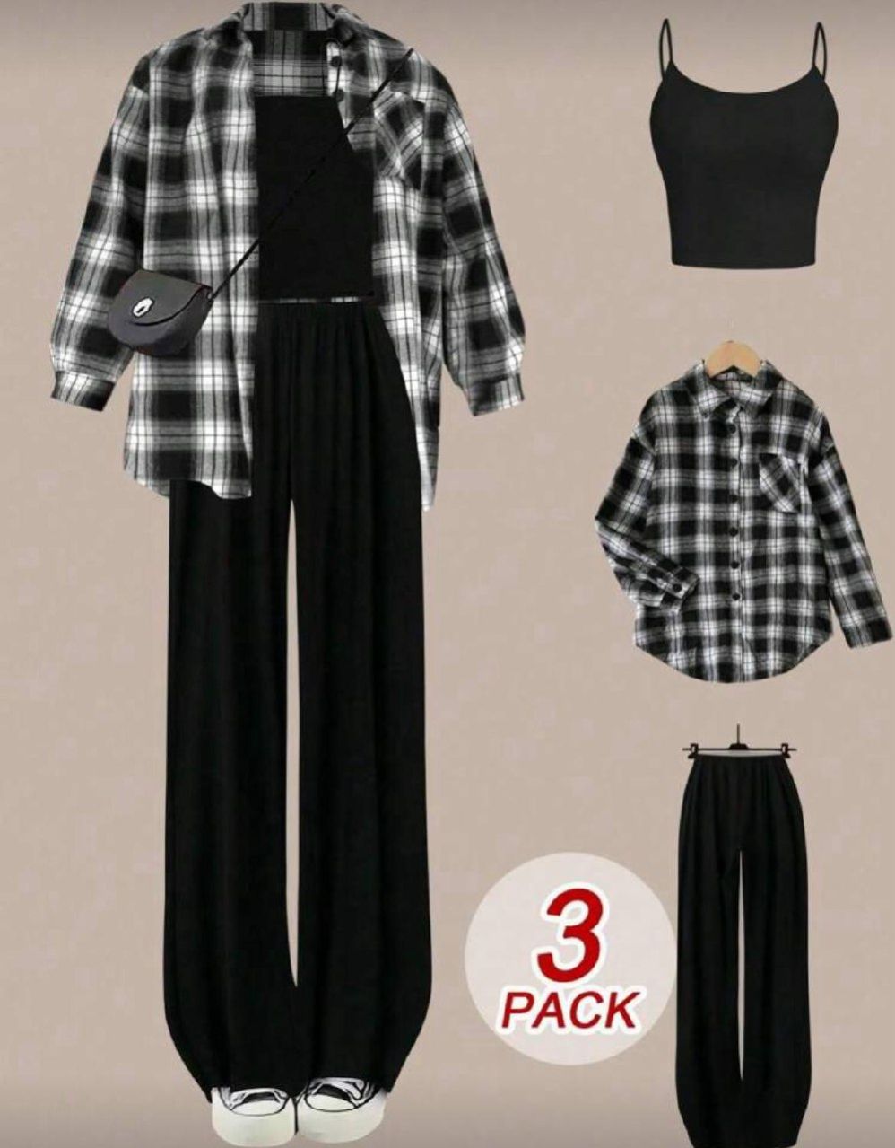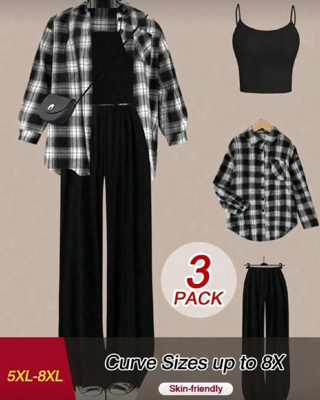 0 Review Of Product SHEIN CURVE+ مجموعة مكونة من 3 قطع: قميص كاجوال مربع الشكل، بلوزة أكمام واللون أحادي، وبنطلون أحادي اللون مقاسات كبيرة
