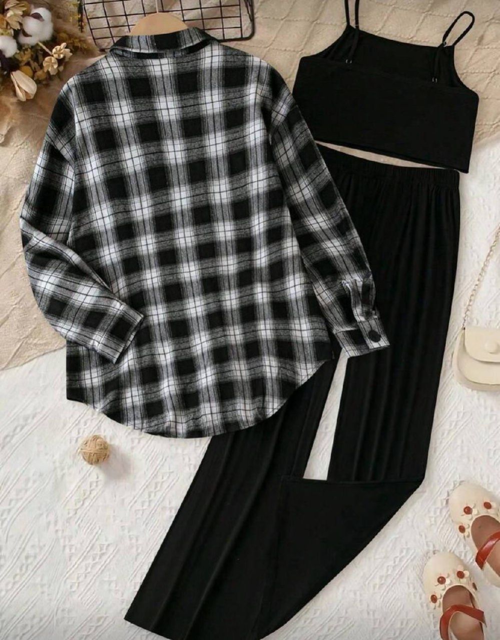 SHEIN CURVE+ مجموعة مكونة من 3 قطع: قميص كاجوال مربع الشكل، بلوزة أكمام واللون أحادي، وبنطلون أحادي اللون مقاسات كبيرة