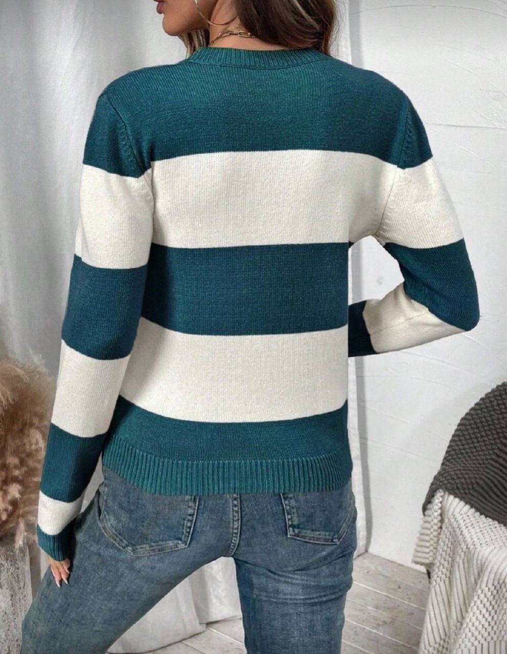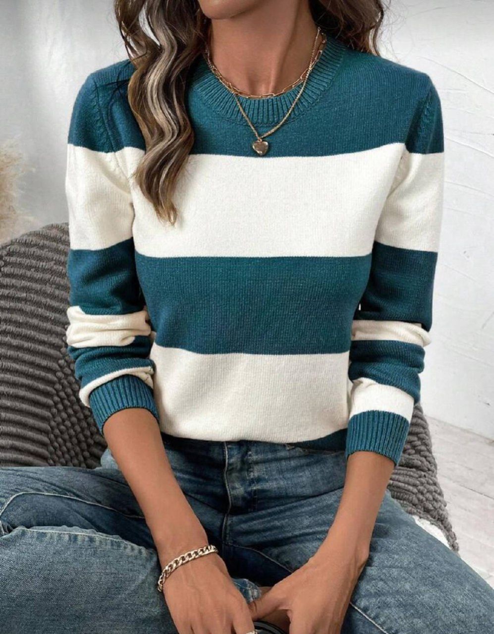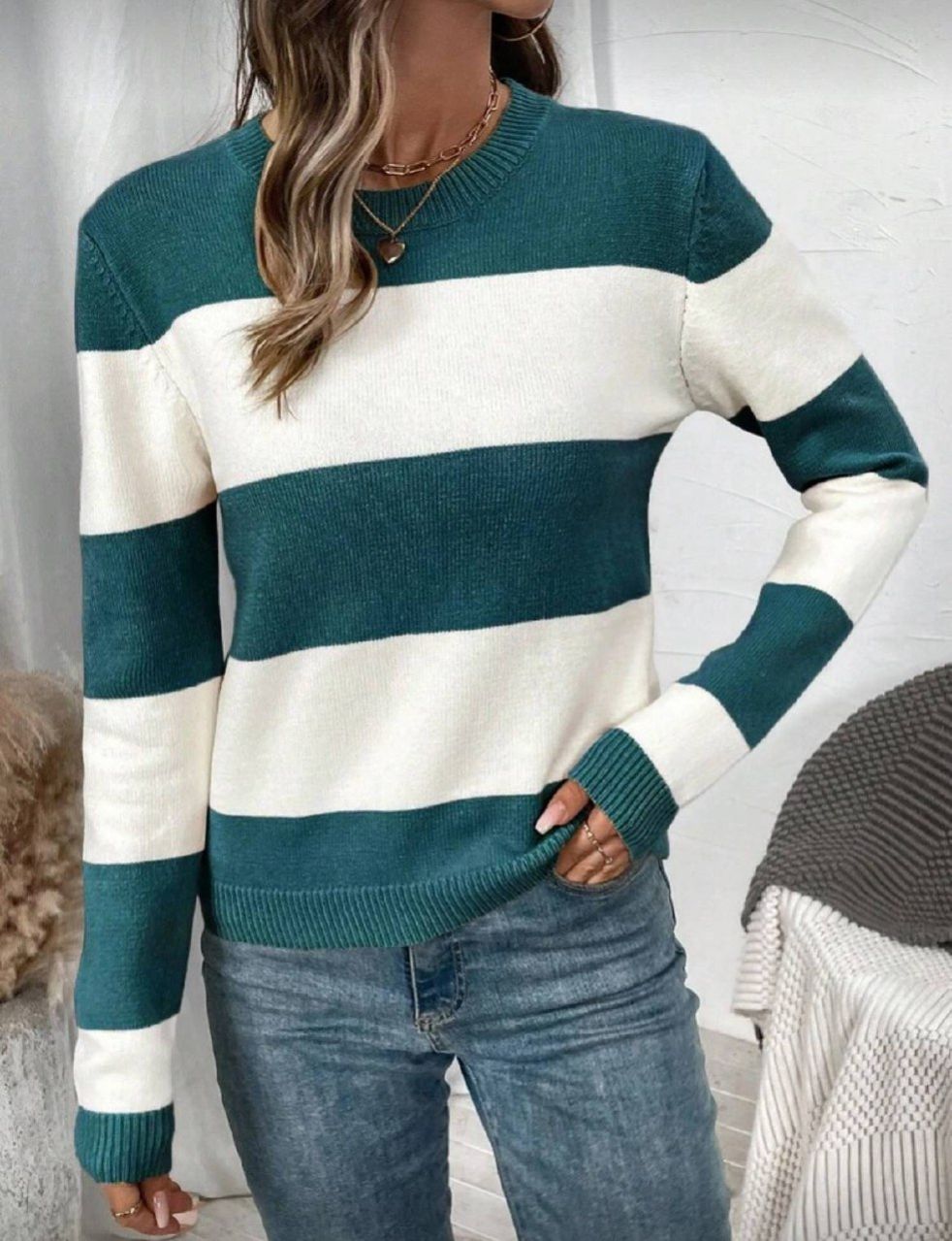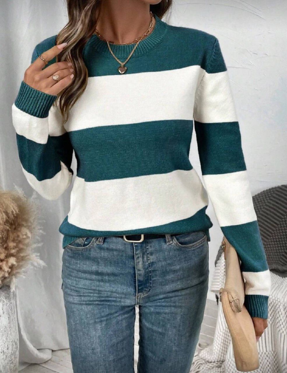 SHEIN PETITE كنزة صوفية كاجوال للنساء للخريف/الشتاء، متعددة الاستخدامات وأنيقة للخروجات والمواعيد والعمل والمدرسة والأعياد مثل يوم الاستقلال ويوم العمال ويوم كولومبس وعيد الشكر وعيد الحب. بطراز فينتاج وسكندنافي وكوري، بتصميم كتل لونية ومخطط محبوك