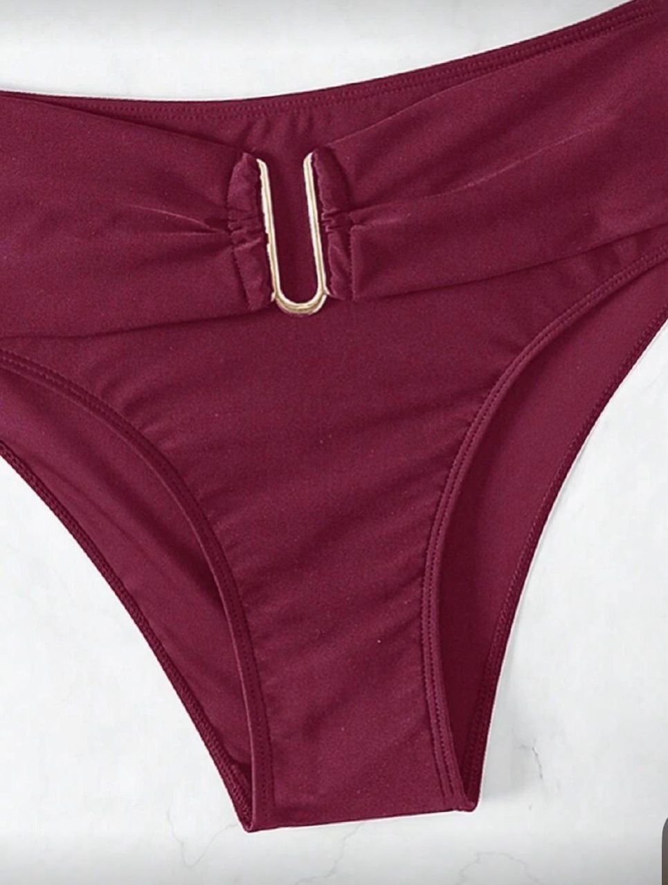 0 Review Of Product SHEIN Swim مجموعة بكيني قطعتين من قطعة سفلية عالية القطع ذات لون أرجواني ثابت وأشرطة سميكة قابلة للتعديل وزخرفة على شكل حرف U ذهبي لموسم ربيع/صيف 2026 للنساء