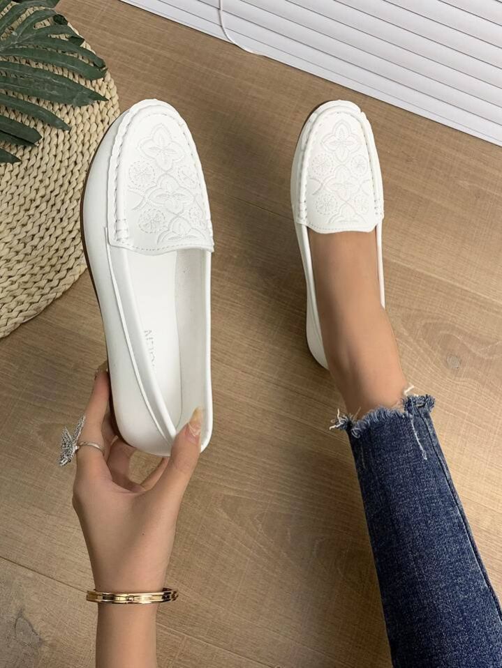 حذاء مسطح بدون كعب مطرز بأزهار سهل الارتداء موضة أبيض امرأة القياس : 37