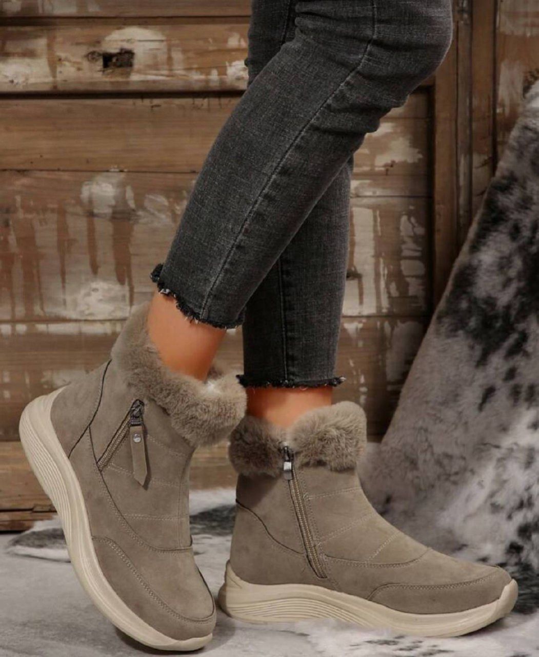 بوت ثلج ناعمة ومريحة للنساء، ذات أصابع مستديرة وأربطة، مانعة للانزلاق وذات كعب منخفض، بوت شتوية بني داكن عصرية دافئة مبطنة بالفرو، بوت فرو