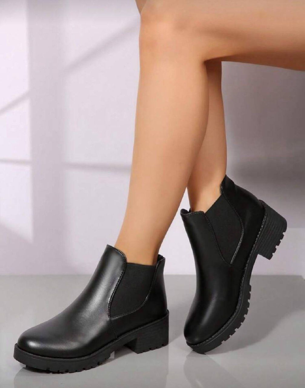 بوت قصيرة للنساء، لون أحادي كعب مربع، رؤوس مستديرة، بوت فستان، طراز مدرسي كلاسيكي، مريحة وقوية، بوت كاحل سهلة الارتداء، بوت خارجية مزينة بإبزيم