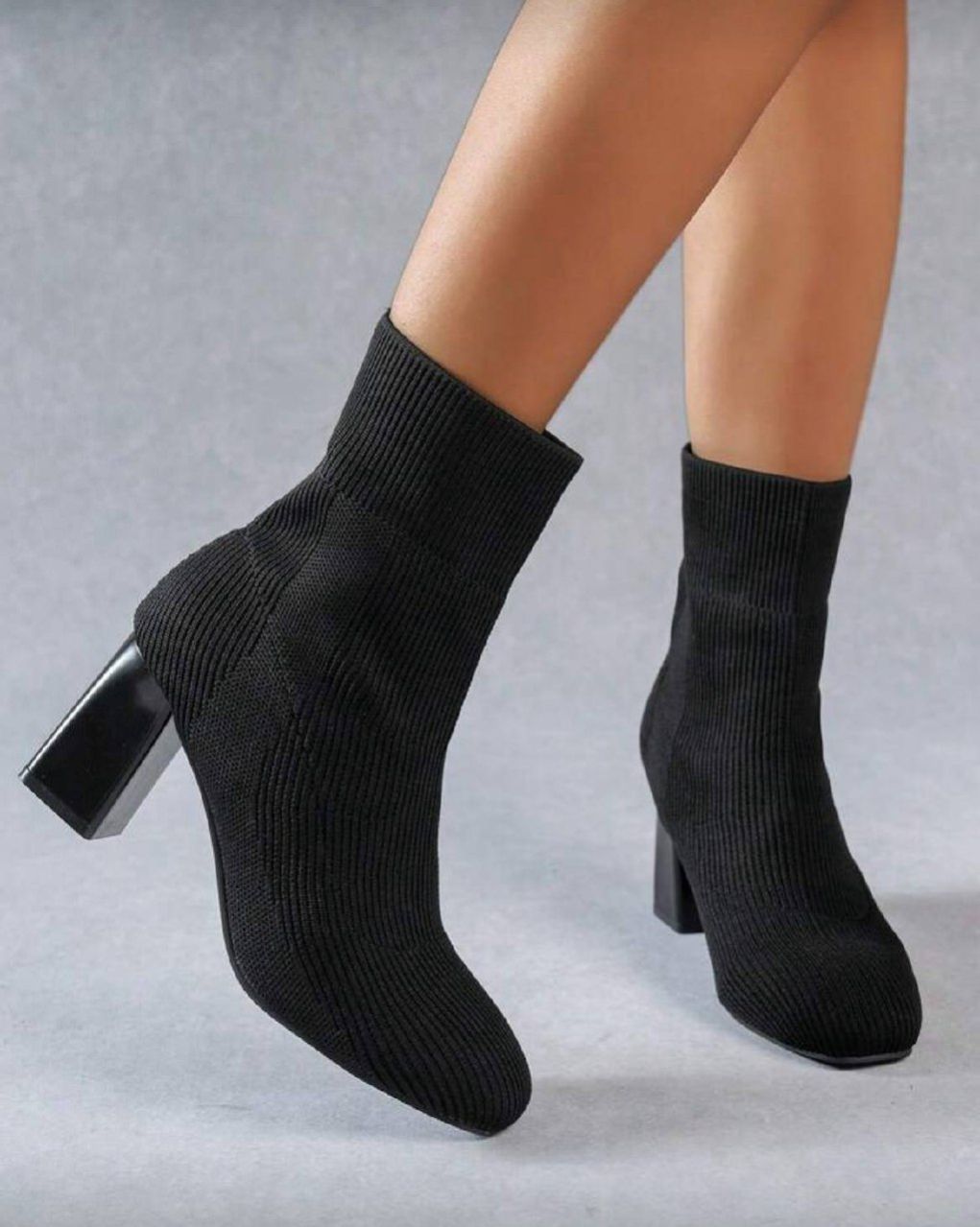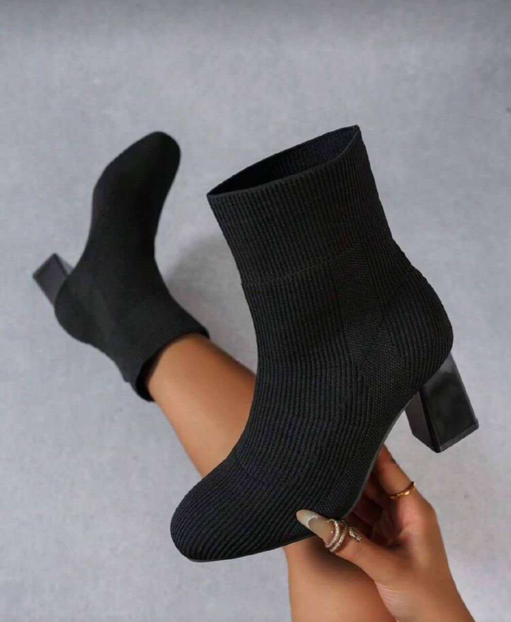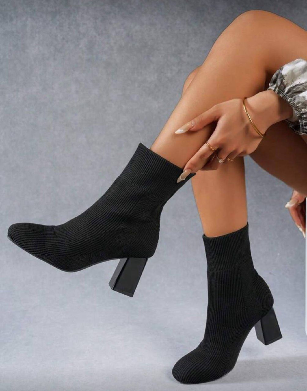 بوت نسائية موديل 2025 جديدة للخريف، بوت كاحل مصنوعة من الأقمشة المنسوجة المرنة، ذات رؤوس مدببة وكعب سميك عالي، بوت جوارب ضيقة ذات لون أسود بسيط مناسبة للحفلات